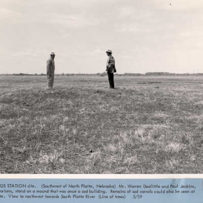 Also: "Cold Springs Station site. (Southwest of North Platte, Nebraska). Mr. Warren Doolittle and Paul Jenkins, Nebraska historians, stand on a mound that was once a sod building. Remains of sod corrals could also be seen at this station site. View to northwest toward South Platte River (Line of trees). 5/59"