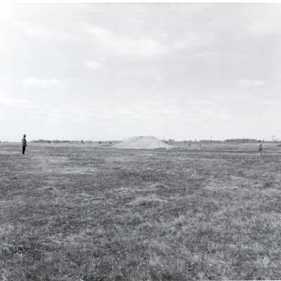 95.1P.397 = Two men standing in grassy field, Dirt hill in background. Legend: "Cold Springs Station Site. View to N.W. Located S.W. of North Platte, Nebr. on property of Warren Doolittle. Figures indicate extent of corral. 5-59."