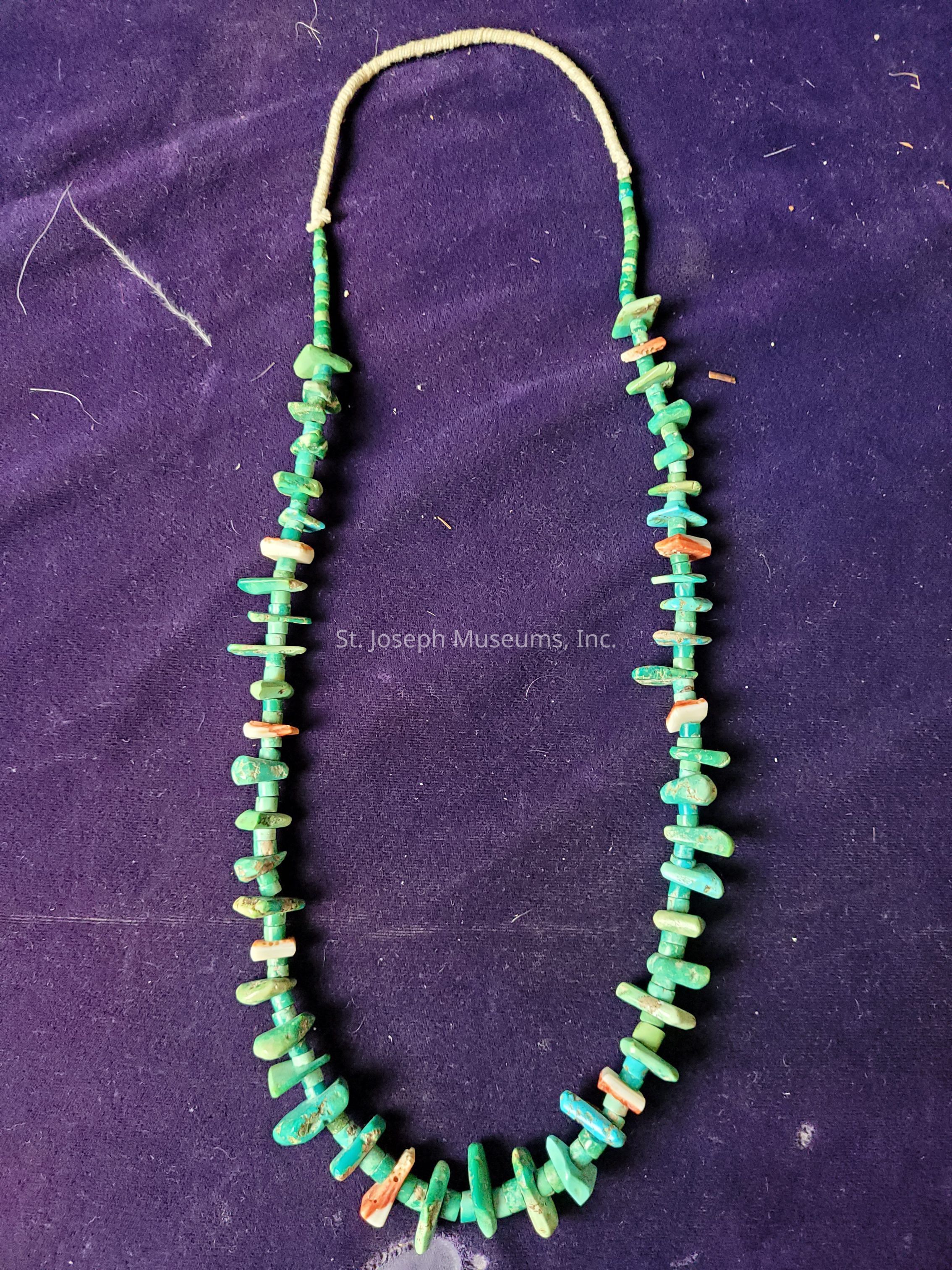 Necklace/single strand of natural turquois nuggets with spondylus shell beads interpersed/carved turquois round beads used as spacers/necklace is finishing with hard wrapped bead closure/donated by Pam Smith Connelly.