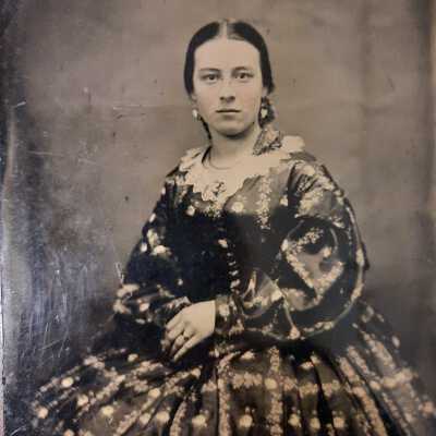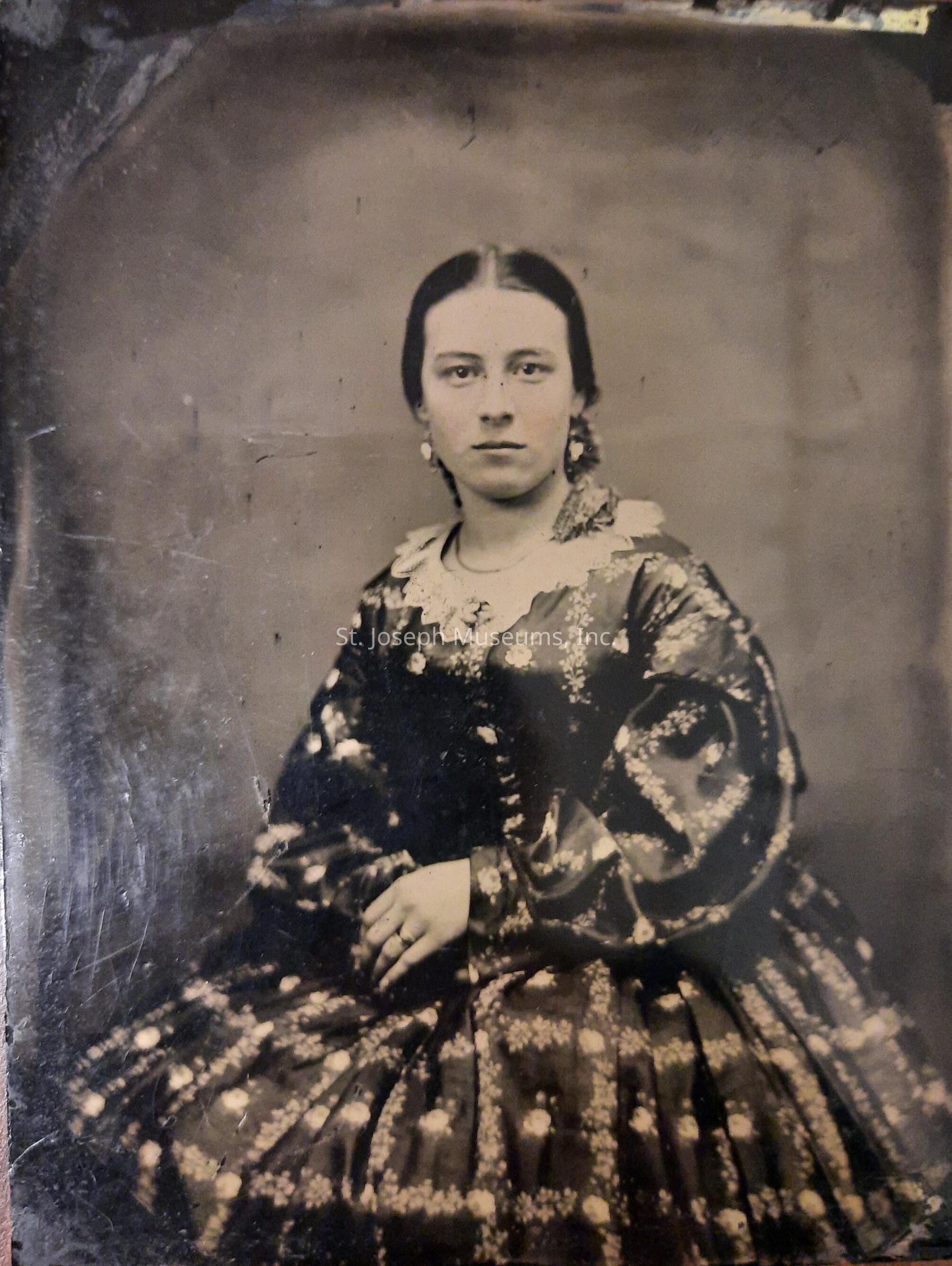 Glass negative of Josephine Robidoux Corby - Seated, hands in lap, patterned dress with low lace collar, hair pulled back parted in middle. c. 1860's.