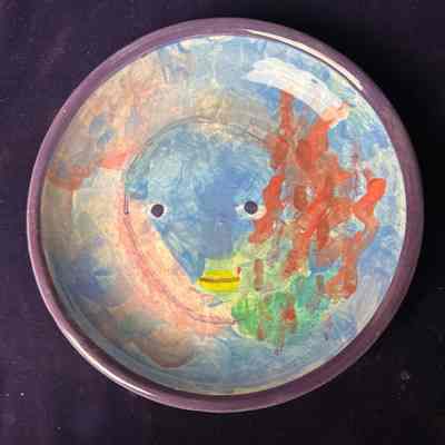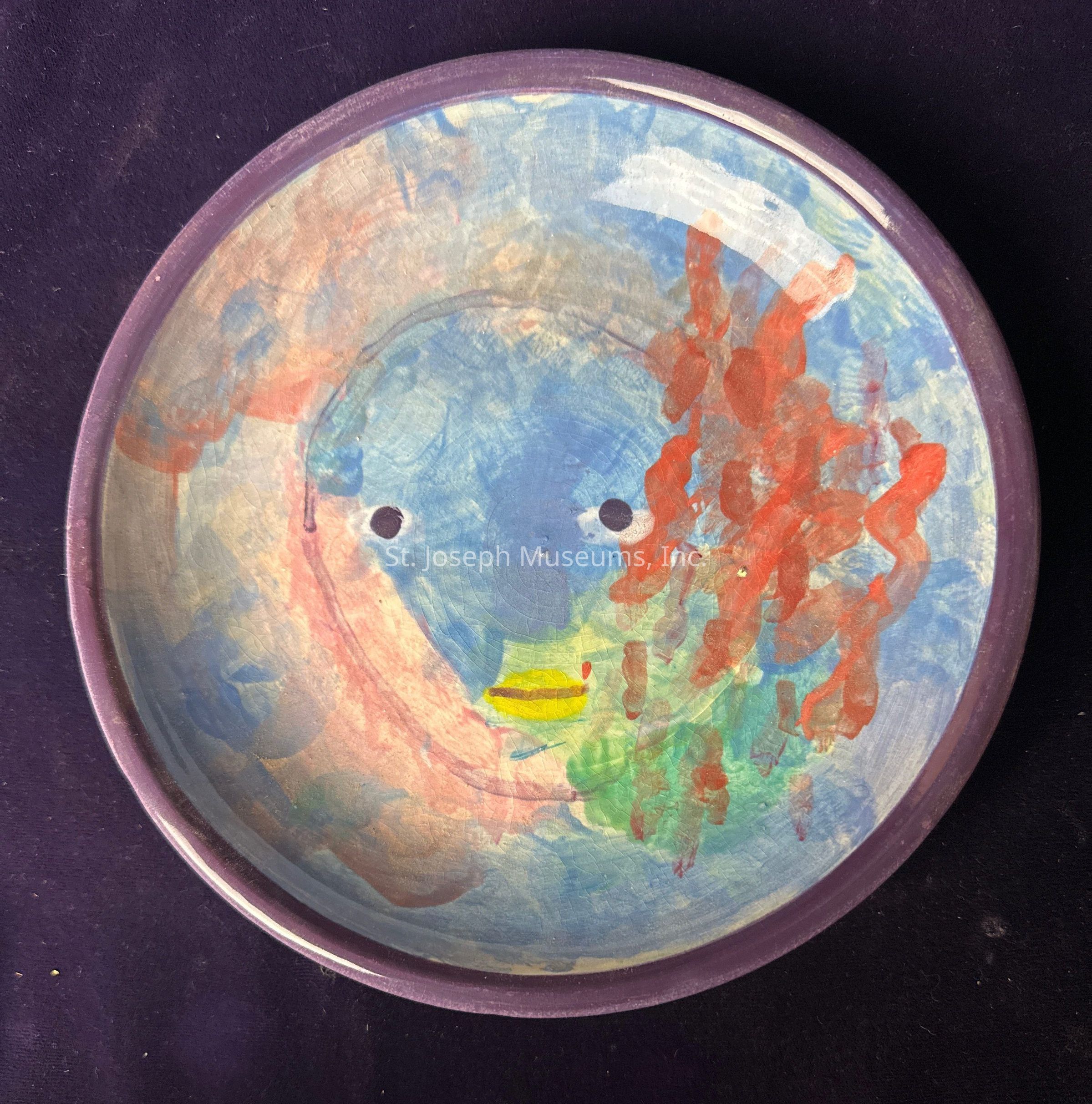 Blue, purple, pink, red, green, yellow dish with geometric face created by the artist Don Beaulieu (bow-lyoo)Context