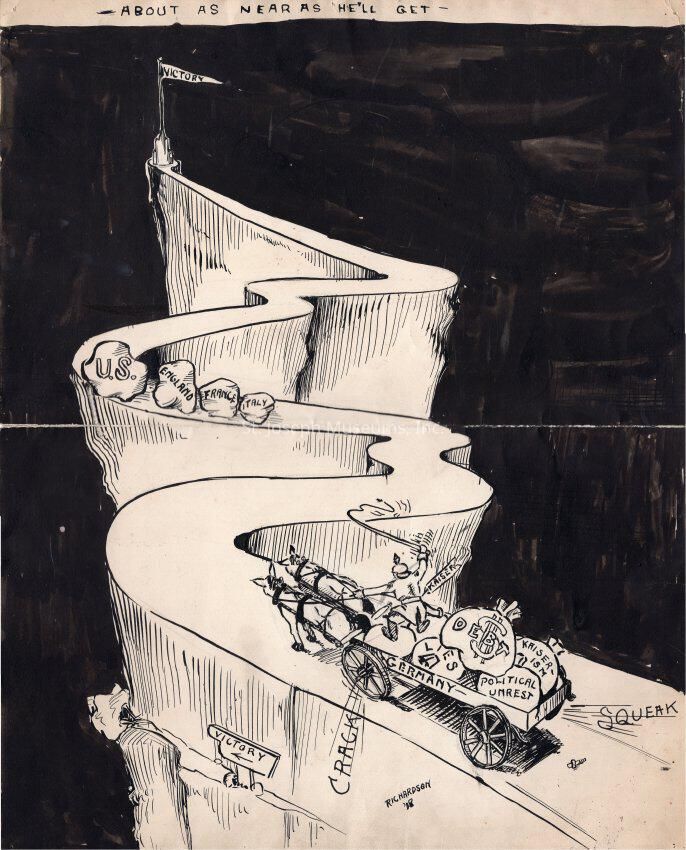 Richardson (Lloyd) World War I Political Cartoon, 1918. Black ink drawing entitled "About as Near as He'll Get". Depicts a steep mountain road with Victory flag at top. Boulders "U.S., England, France, Italy" close the road nearer the summit. A German soldier is driving a team & wagon up the steep incline. The load in the wagon is "Lies, Debt, Political Unrest, Kaiserism". The wheels sound "Crack" and "Squeak". Signed. Richardson '18.