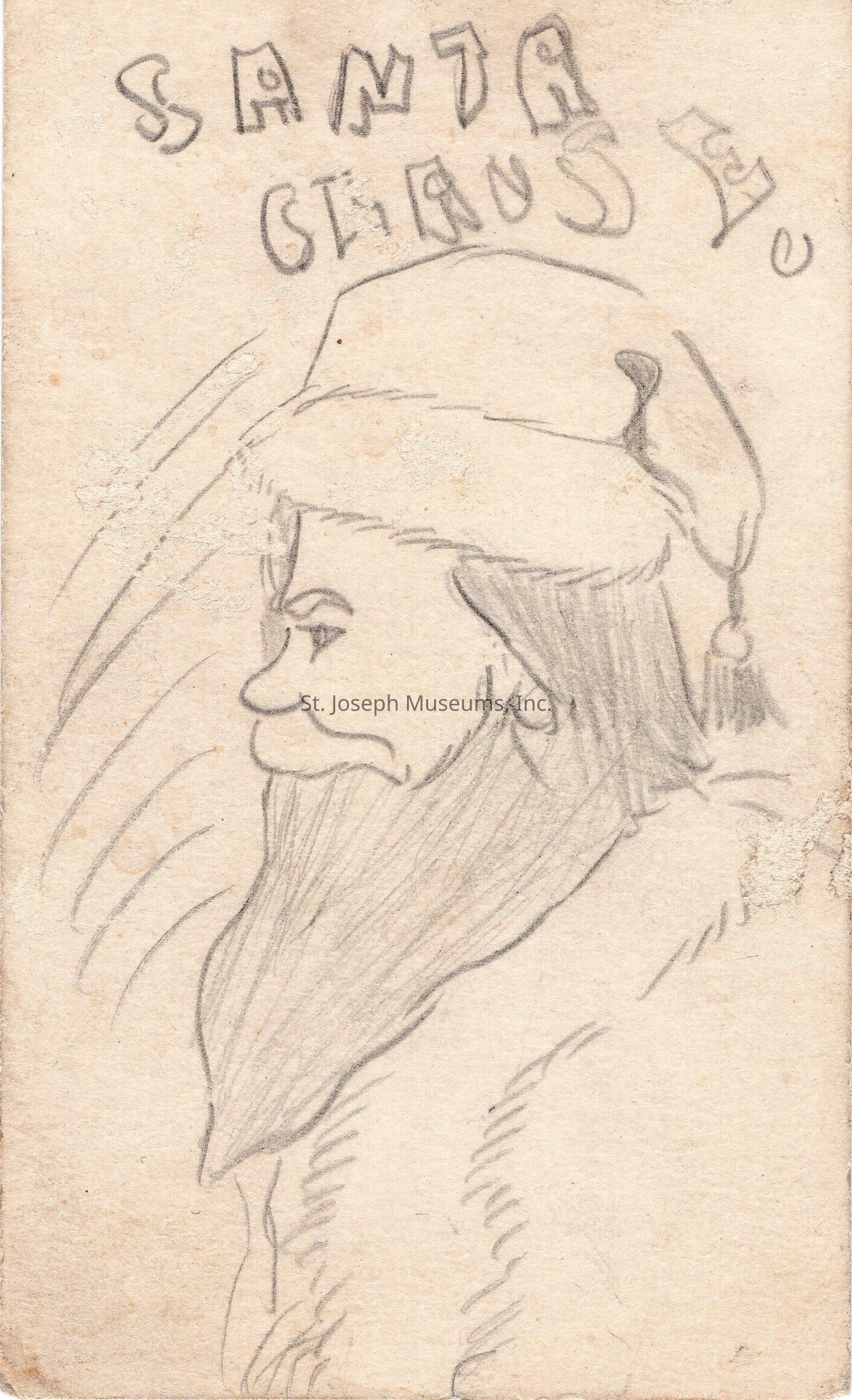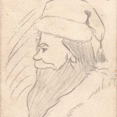 A = Santa Claus, bust drawing, profile looking to left. Handwritten on back: "Dec. 1915, Lloyd Richardson". on cardboard, 2¼" x 4"