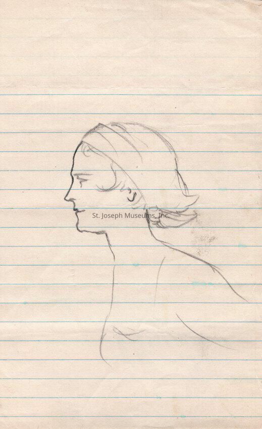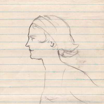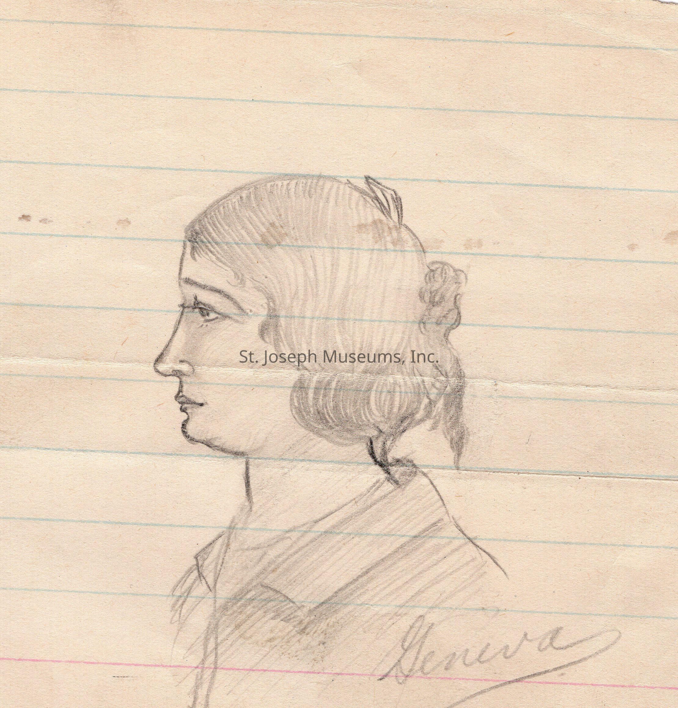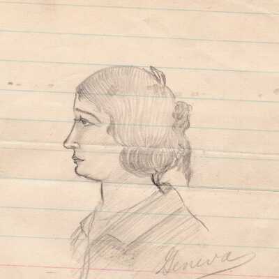 B = Geneva, Sketch of woman, bust profile looking to left. "Geneva" handwritten on her right shoulder. on lined tablet paper, 4" x 4".