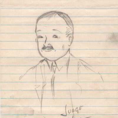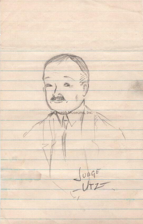 D = Judge Utz, bust view of man with round face, thinning hair, wearing suit. "Judge Utz" handwritten at right corner. on tablet paper, 8" x 5"