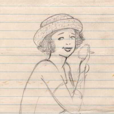 E = Young woman with powder puff (?). Sketch from waist up of young woman wearing a rounded hat over a bobbed hairdo, holding a puff (?) up to her face with her right hand. on tablet paper, 8" x 5"