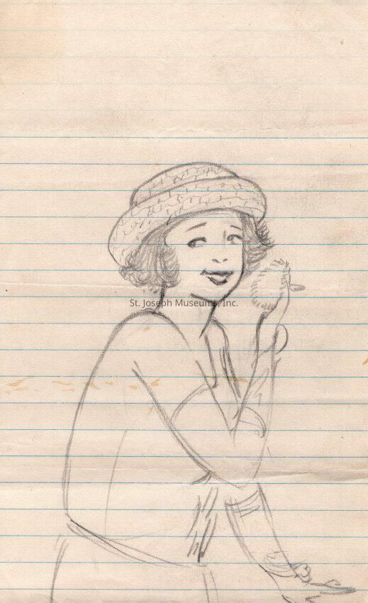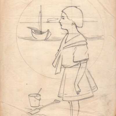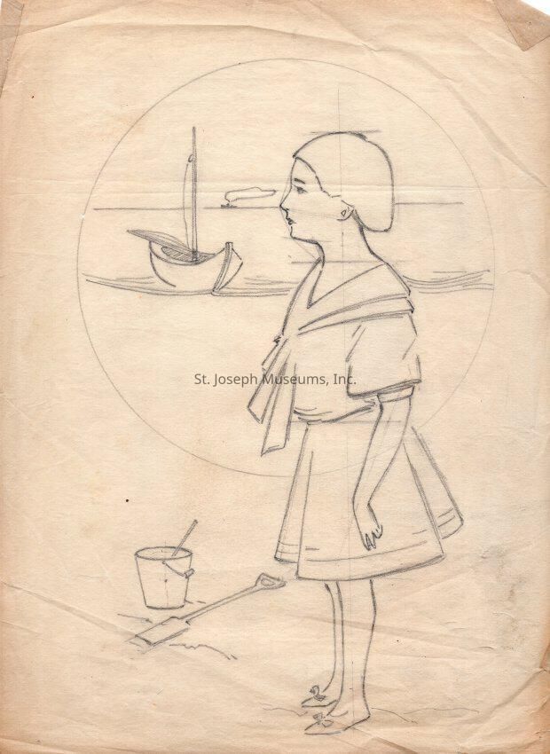H = Girl on beach, wearing sailor dress, sand pail & shovel at her feet. Behind her in circle is a sailboat on water. Sketch is on tracing paper, and a carbon copy is included on paper. Poor condition, edges torn, dog-eared. 9" x 12".Lexicon