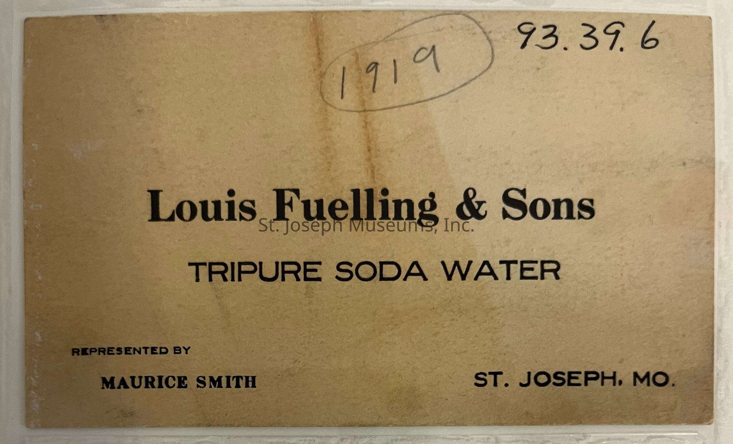 Louis Fuelling & Sons Tripure Soda Water Business Card, c. 1920.
