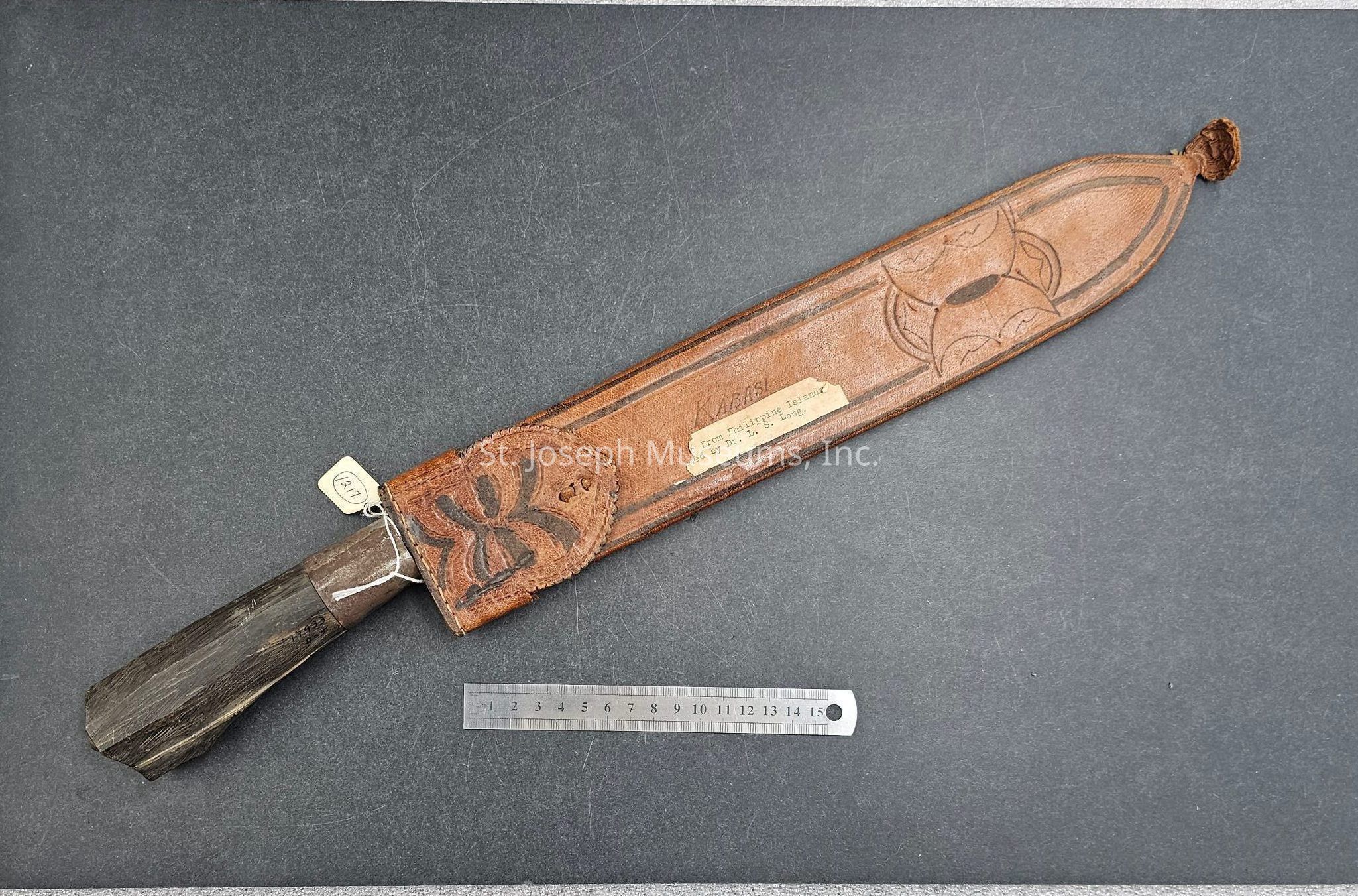 SHEATH/ORNAMENT ON END OF SHEATH/"KABASI" Demetrio de Guzman, Calasiao Pangasinan Philippines inscribed on the back of the sheath