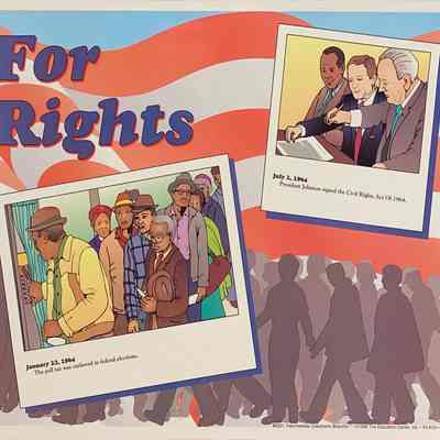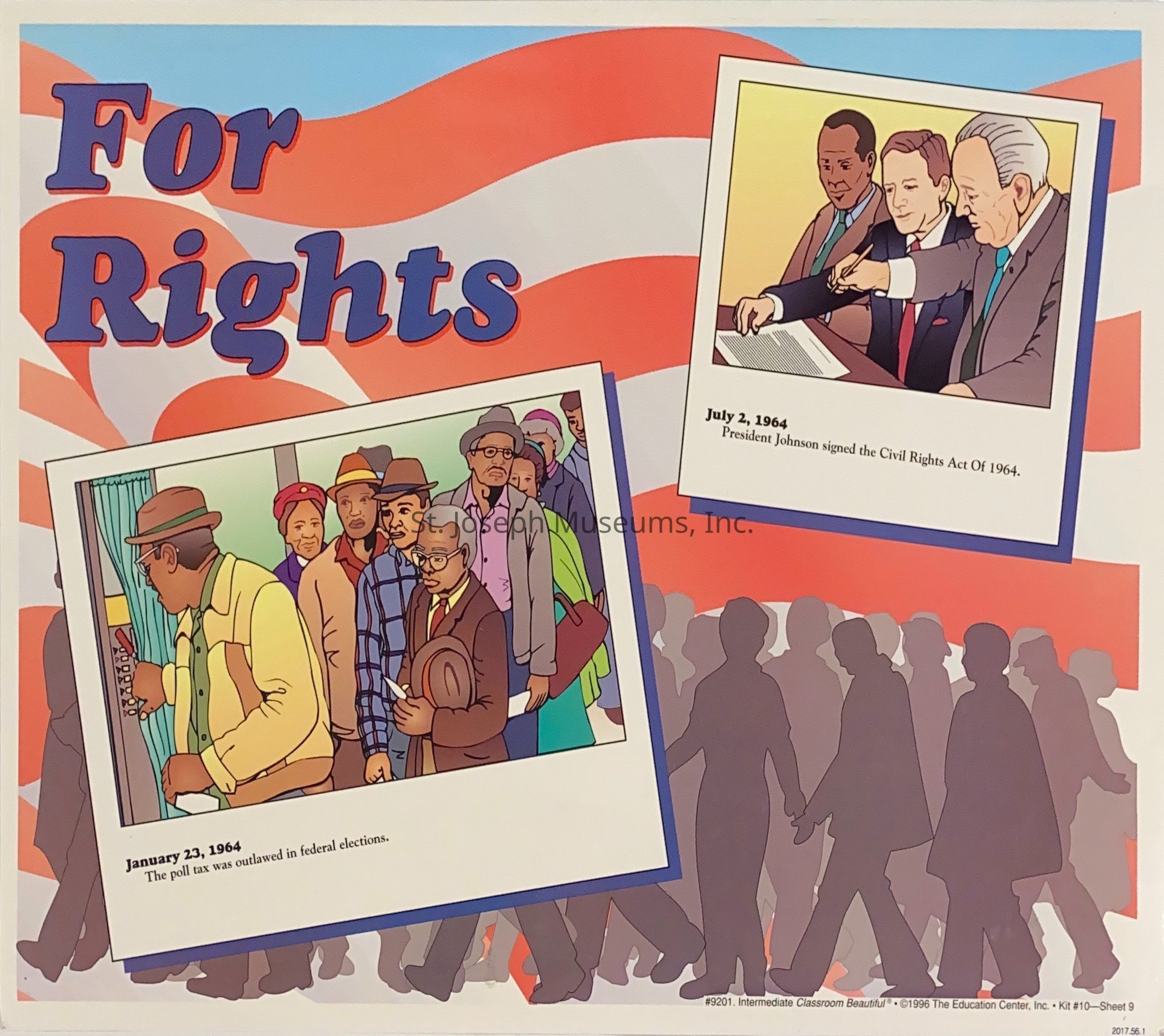 Civil Rights Educations Poster, "For Rights", 1996. Depicts end of Poll Tax, Jan. 23, 1964 & Civil Rights Act signing, July 2, 1964. Classroom poster by The Education Center, 1996.Lexicon