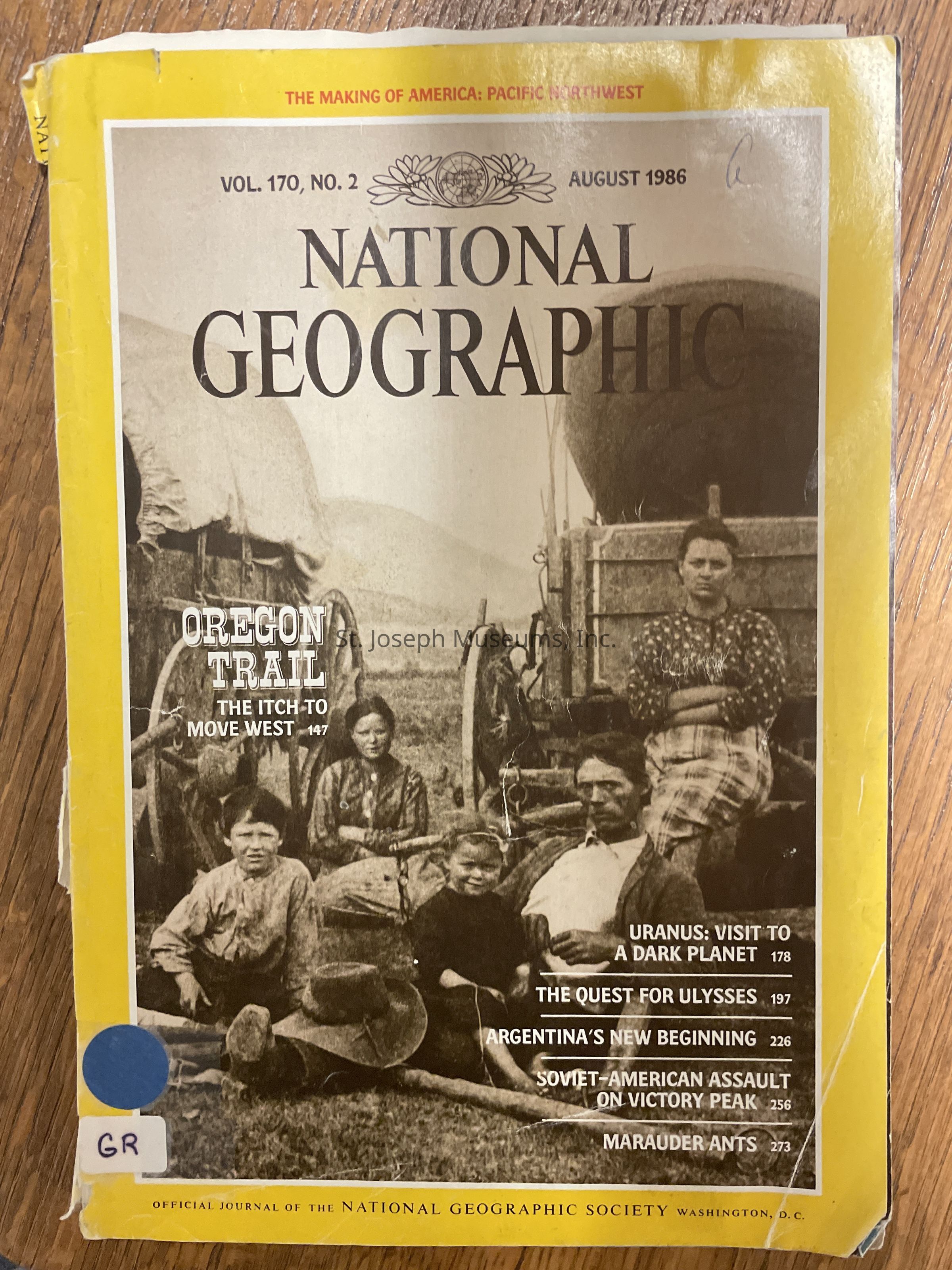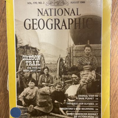 National Geographic, August, 1986, "The Itch to Move West, Life and Death on the Oregon Trail":, an article retracing the Oregon Trail by Boyd Gibbons and photographer James L. Amos, recounting the adventures of the pioneer movement to west. The map supplement, "Making of America--Pacific Northwest" is missing.. Pages 147-177.