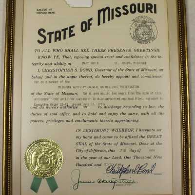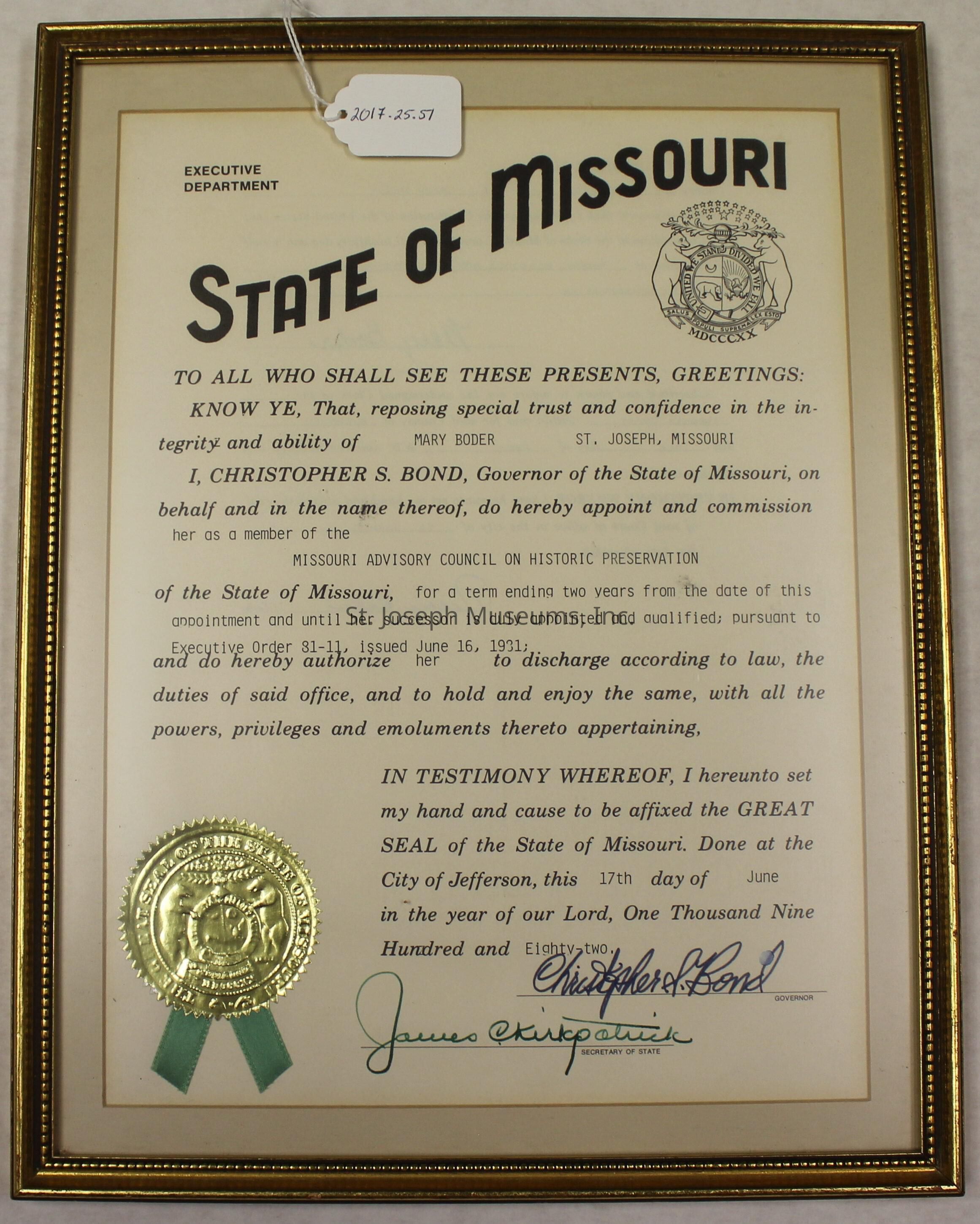 Framed, certificate. "State of Missouri" "To all who shall see these presents, greetings: Know ye, That, reposing special trust and confidence in the integrity and ability of Mary Boder St. Joseph, Missouri. I, Christopher S. Bond, Govenor of the State of Missouri, on behalf and in the name thereof, do hereby appoint and commission her as a member of the Missouri Advisory Council on Historic Preservation of the State of Missouri, for a term ending two years from the date from the date of this appointment and until her successor is duly appointed and qualified; pursuant to Executive Order 81-11, Issued June 16, 1981; and do hereby authorize her to discharge according to law, the duties of said office, and to hold and enjoy the same, with all the powers, privileges and emoluments thereto appertaining. In Testimony Whereof, I hereunto set my hand and cause to be affixed the Great Seal of the State of Missouri. Done at the City of Jefferson, this 17th day of June in the year of our Lord, One Thousand Nine Hundred and Eighty-two.Lexicon