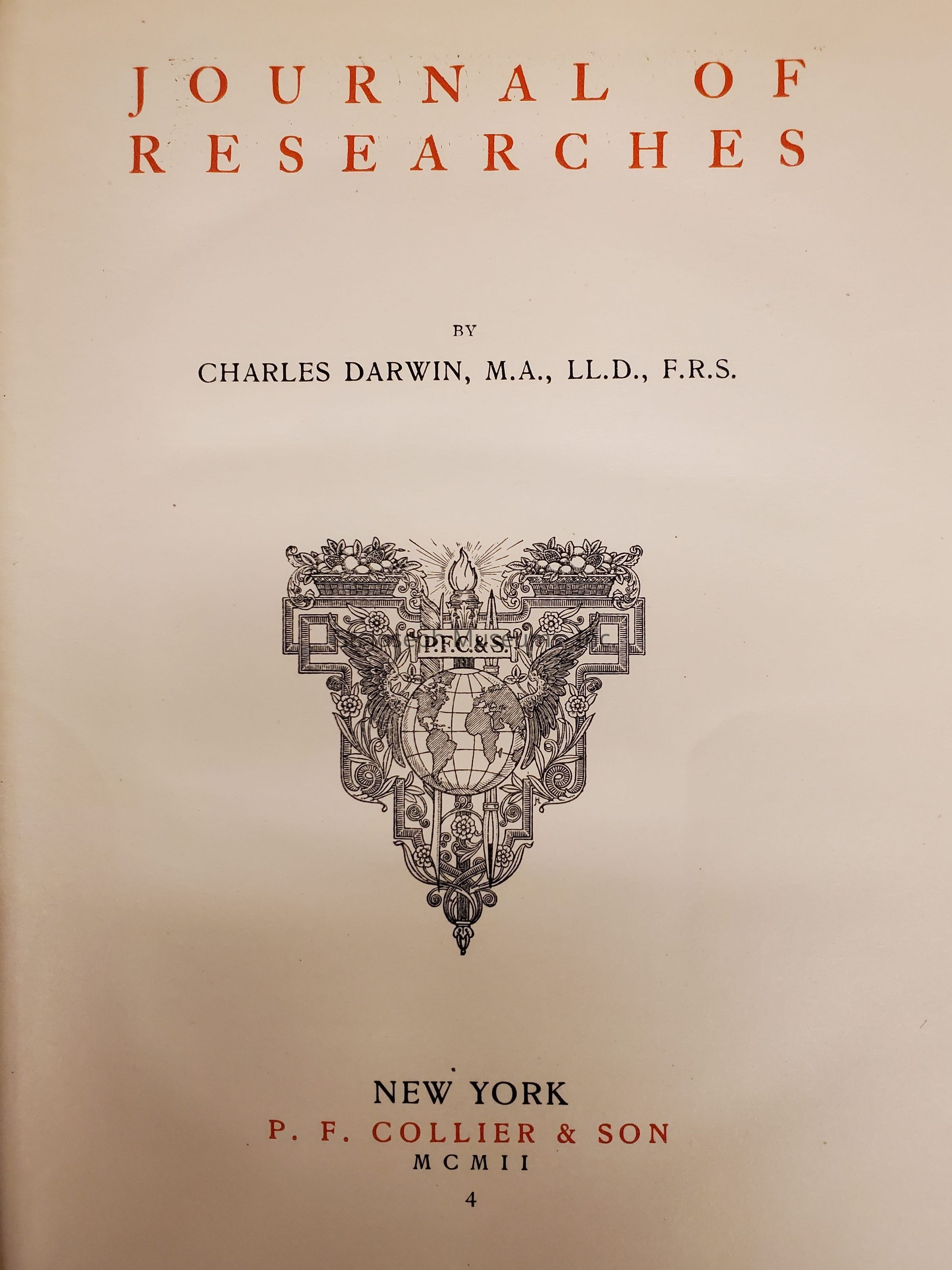 Journal of Researches seems to concerning Charles Darwin's travels and research in South America and some of the Pacific Islands. He mentions mountains, volcanoes,vegetation, animals of all sizes and types, and more. This book is #4 in this series.