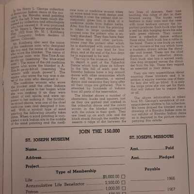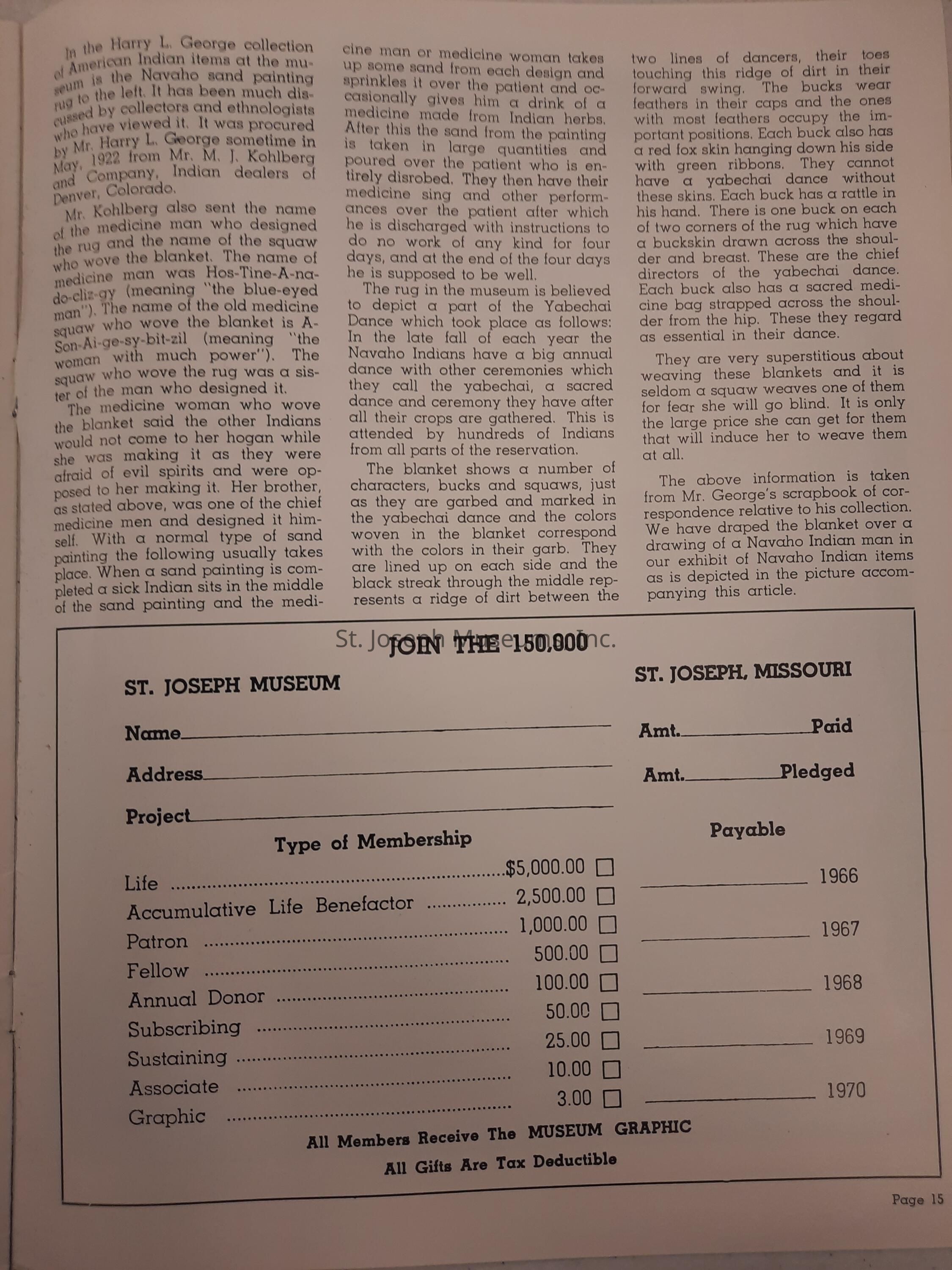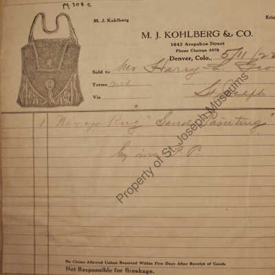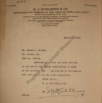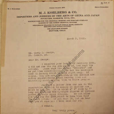 Letters and an invoices from the Harry L. George Ledgers from M. J. Kohlberg in Denver, CO. HLG Ledger Vol. 1 regarding the purchase of a Navajo Yei Be Chi blanket from a native female artisan on the Navajo reservation for $150. The native artist negotiated increasing the price by $50 according to Mr. Kohlberg. Kohlberg states that the blanket is unique in that it represents 28 Yei figures, which he has never seen before. Also says the blanket is approximately 4 foot 8 inches wide by 7 foot long.