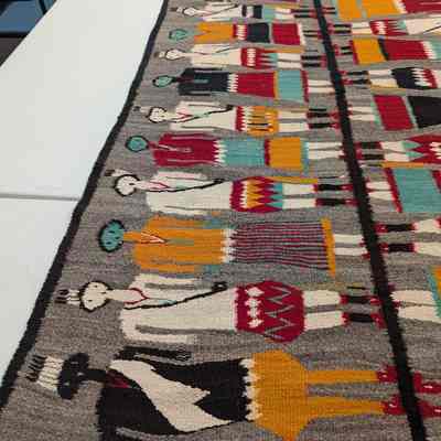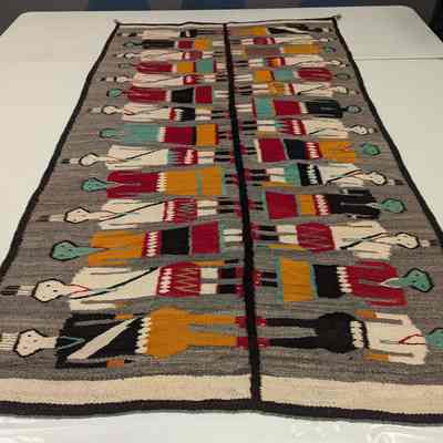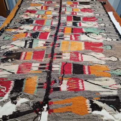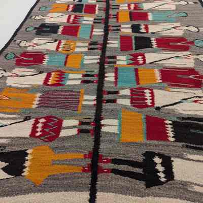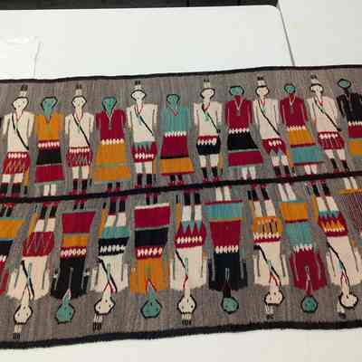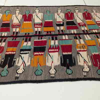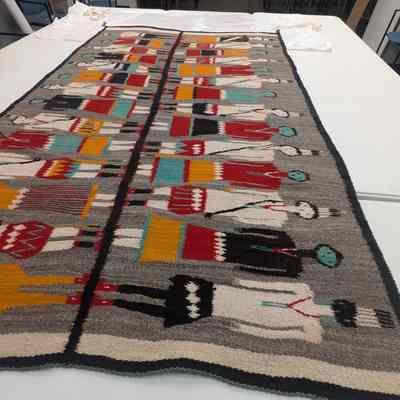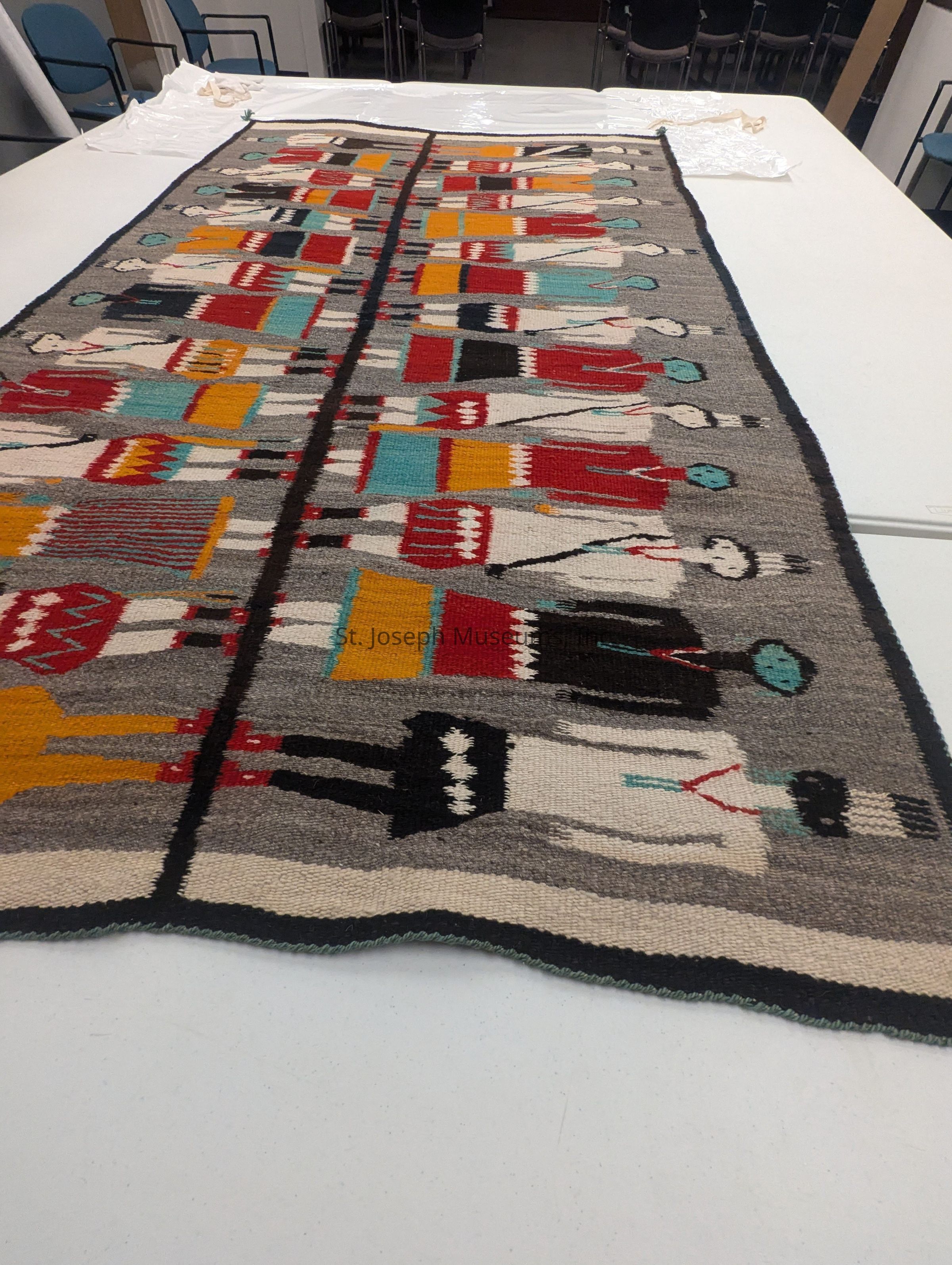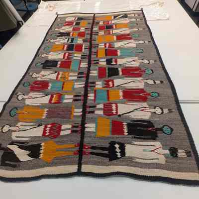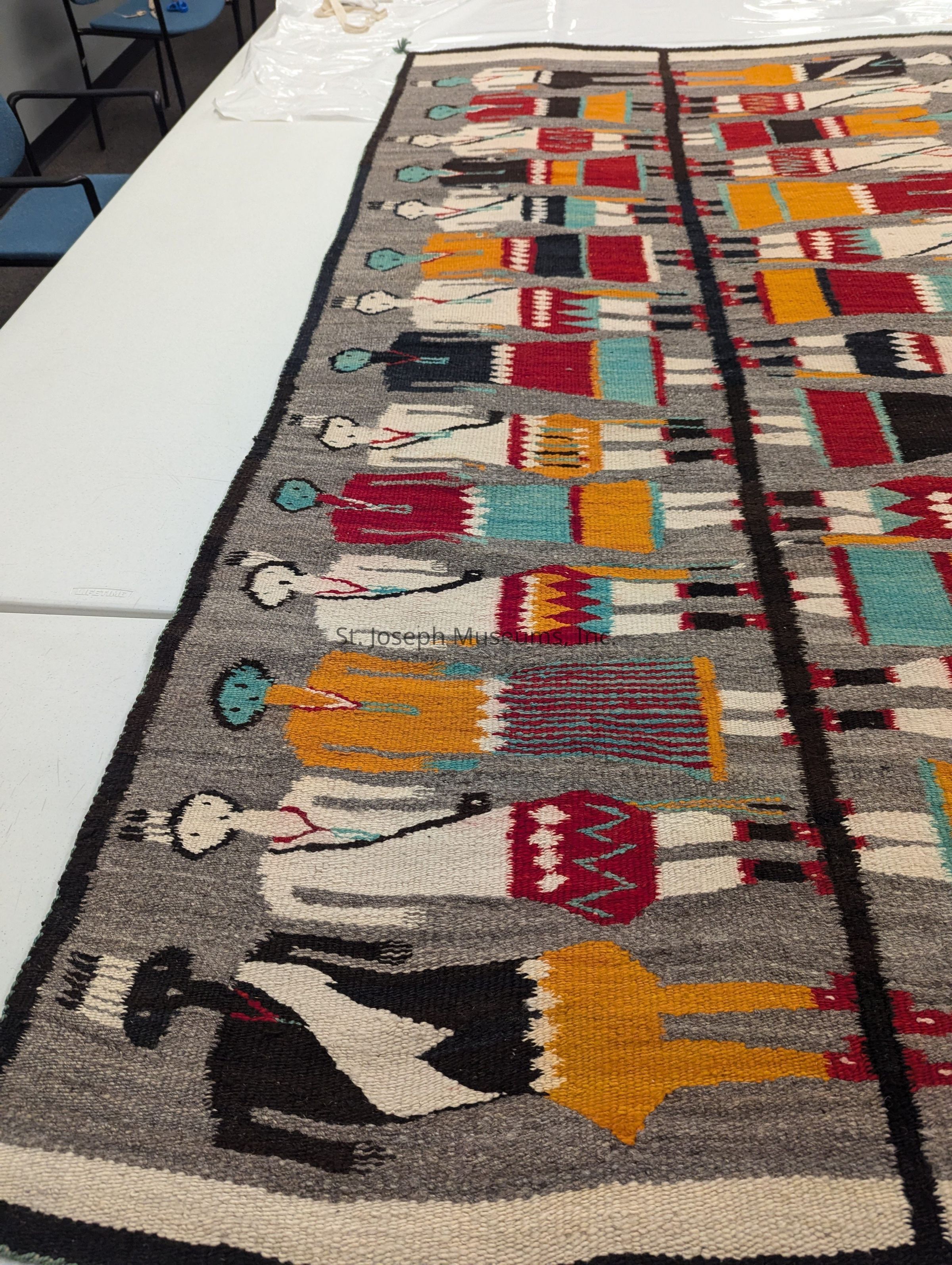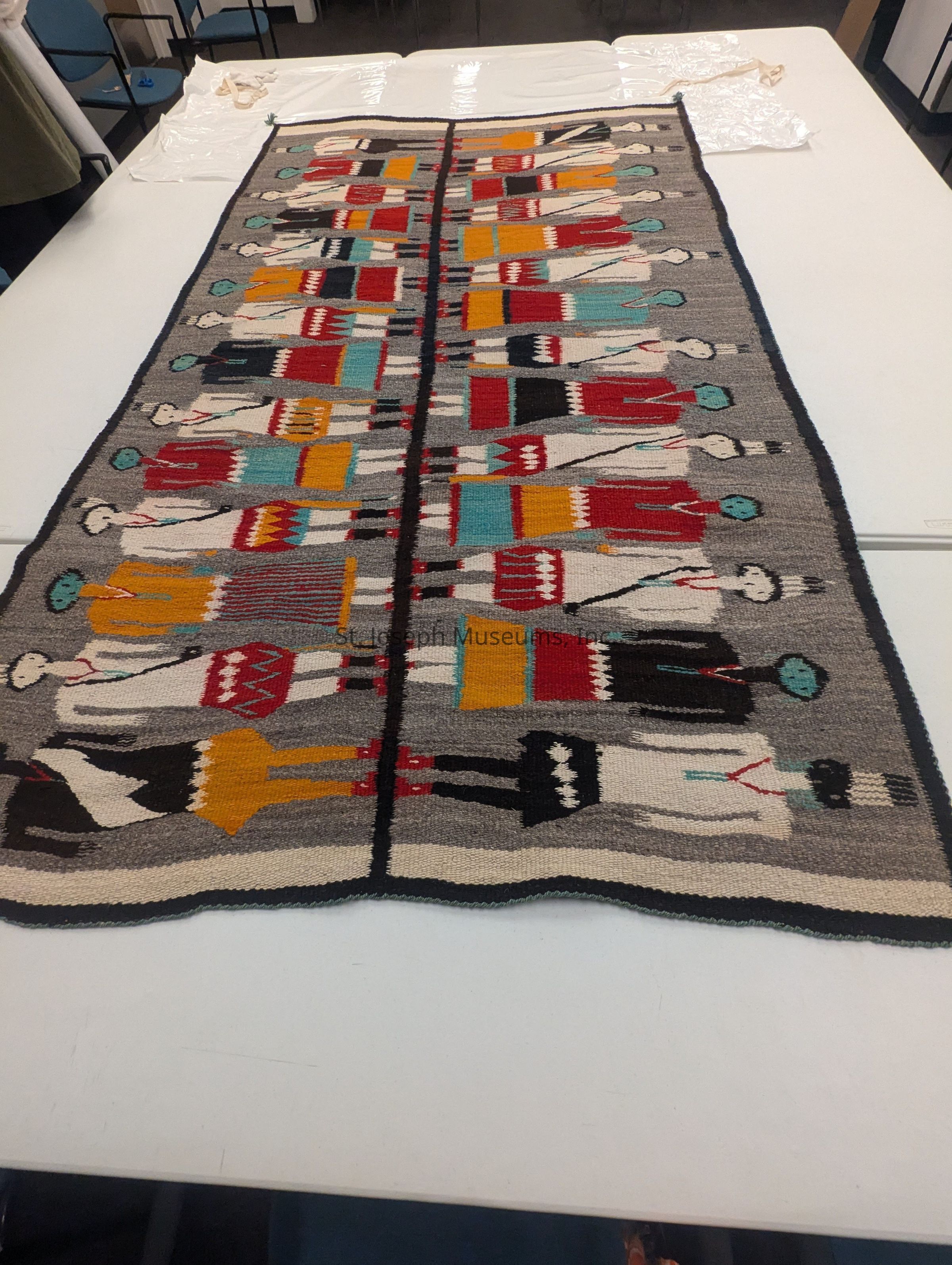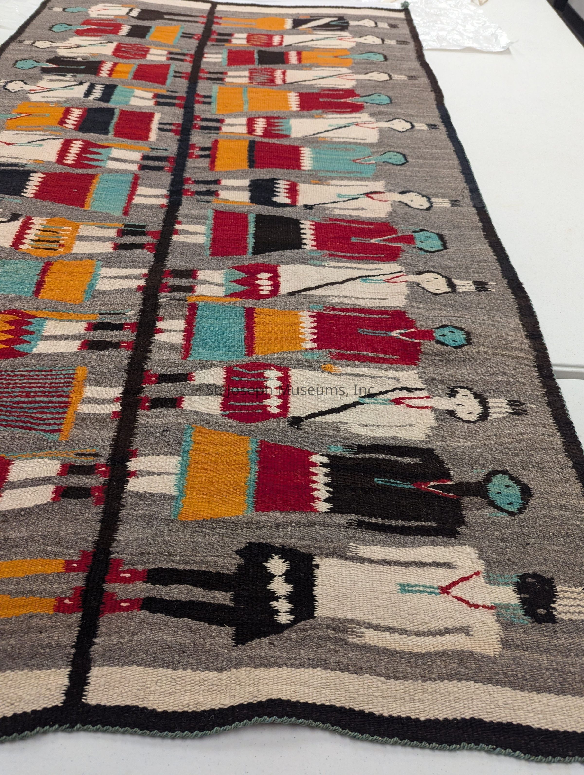 However, due to the description in the Harry George ledgers from M. J. Kohlberg, I am inclined to believe this is the blanket purchased by George in 1922. The blanket is loosely woven in comparison to other Yei and Yei Be Chi blankets. It also steps away from tradition by including more figures than most blankets. It would be interesting to find out more about the native artist who created this blanket and negotiated its price.