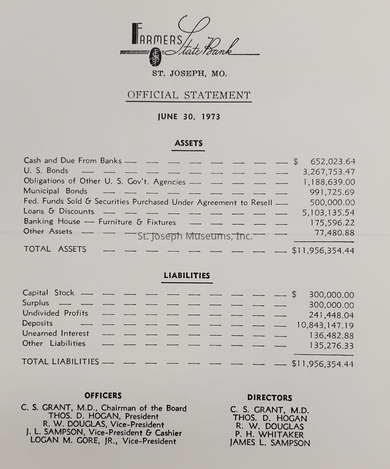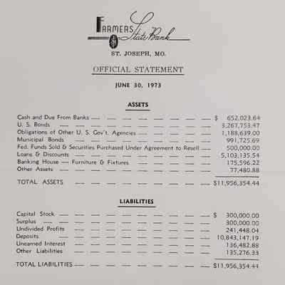 An Official Statement for June 30, 1973 listed are some assets and liabilities for Farmers State Bank.