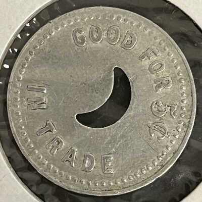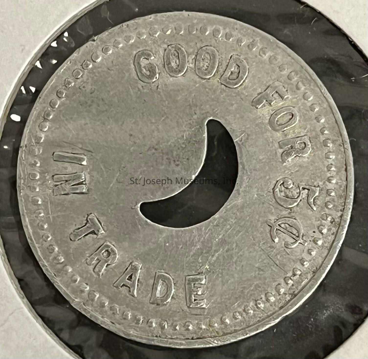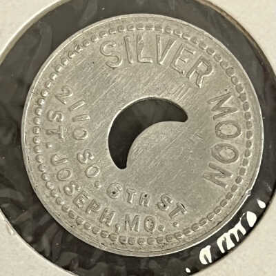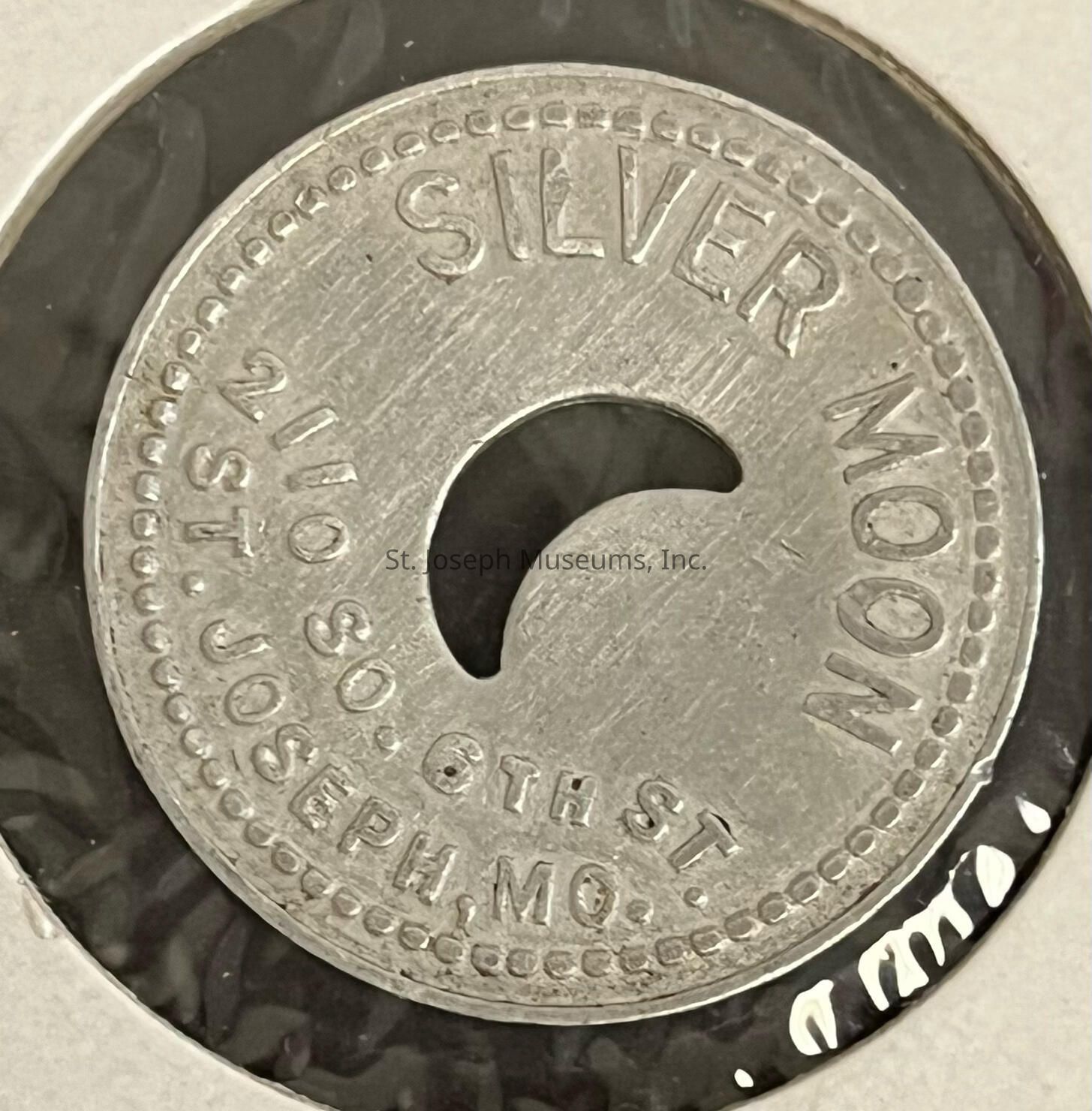 Circular silverish coin in a white paper display. One side has the phrase "Silver Moon 2110 So. 6th St. St. Joseph, MO." A crecent moon shape is cut out of the middle of the coin. The other side says "GOOD FOR 5c IN TRADE". There is a dotted circle around the phrasing on both sides.Collection