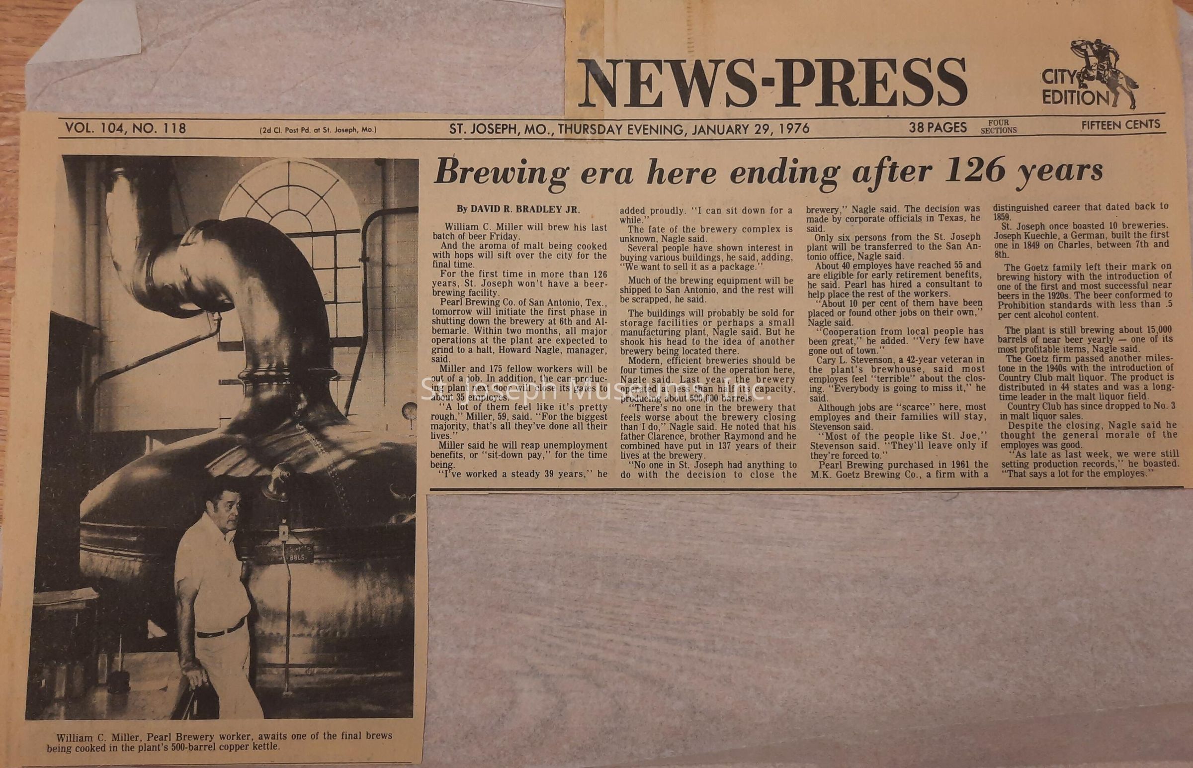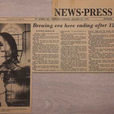 Newspaper clipping - "Brewing Era Ending after 126 Years" - St. Joseph News Press - History of the Brewing industry in St. Joseph, January 29, 1976.Lexicon