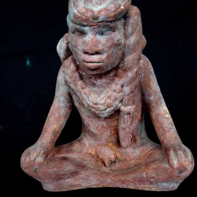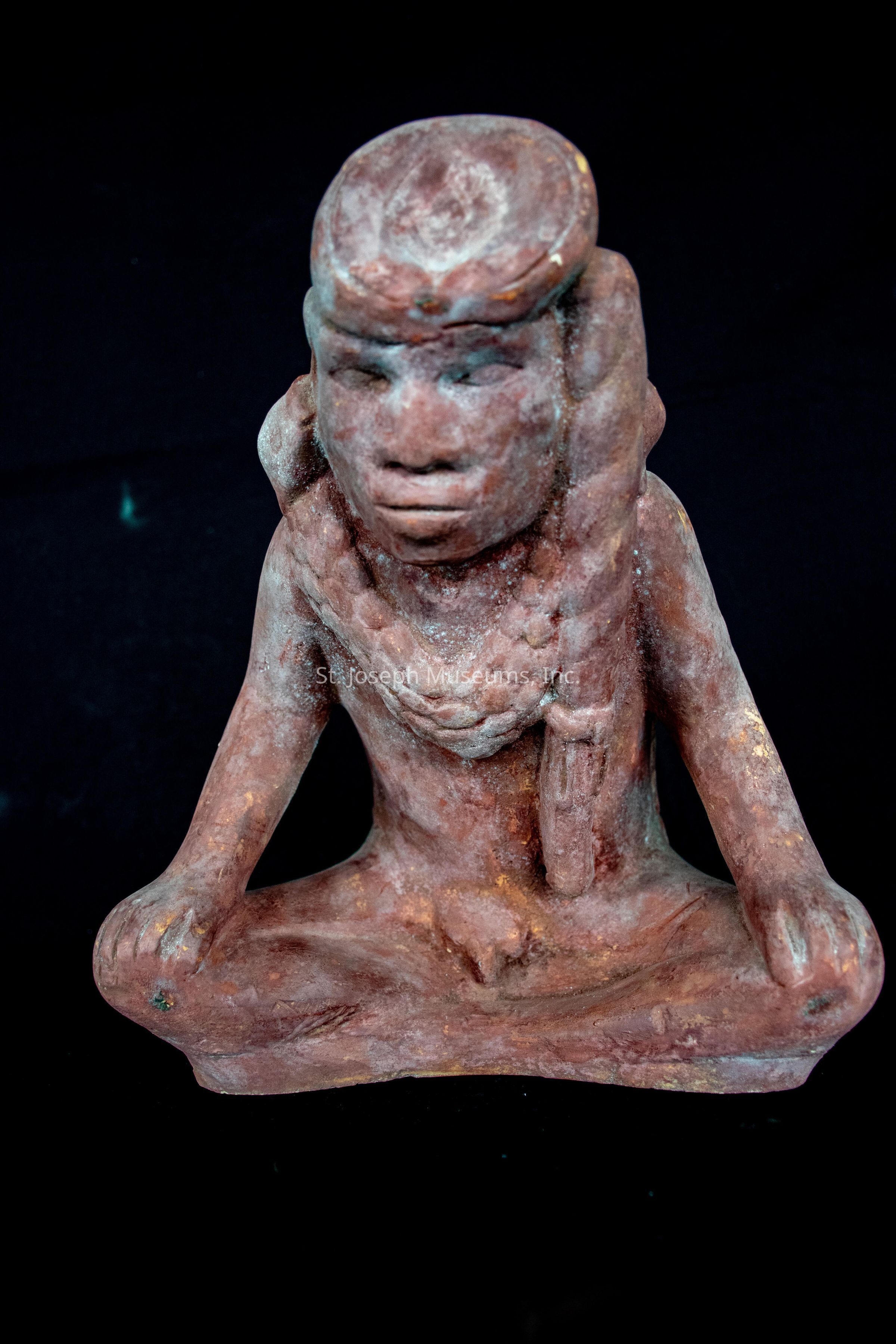 Plaster/copy of "Big Boy" a Spiro Mound figure sitting cross-legged/2 large hole in back - possibly for suspending?
