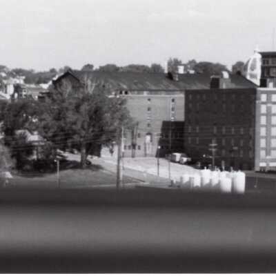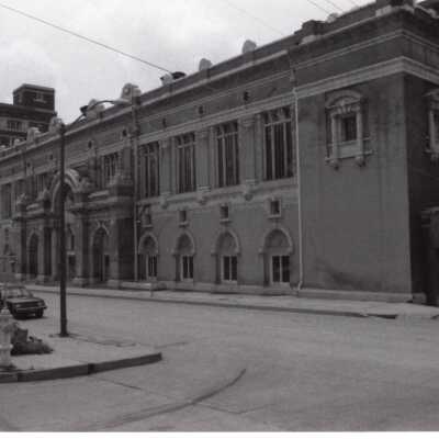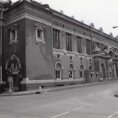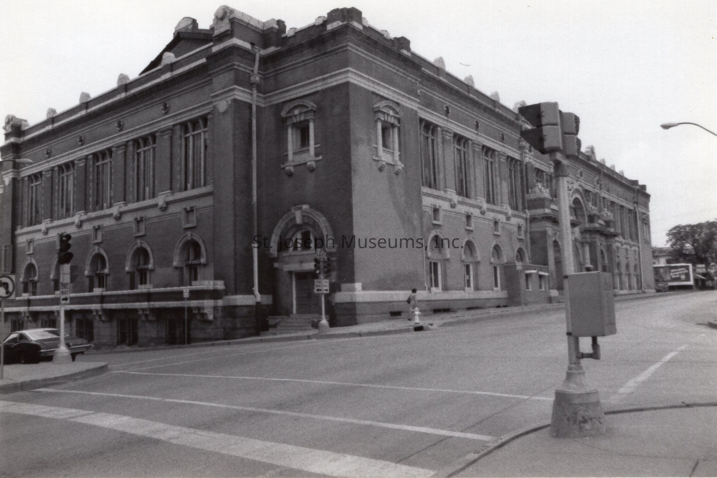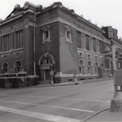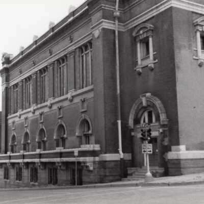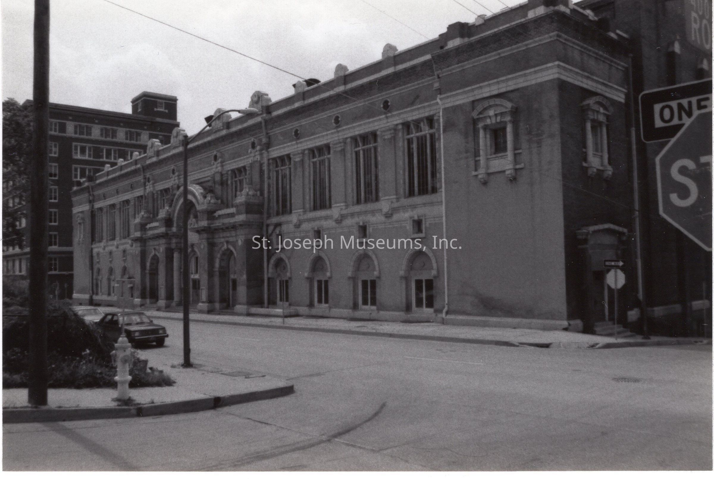 City Auditorium, 4th & Jules, Snapshots (8), 1985. b/w. Seven views of the City Auditorium as it stood in 1985 before it was demolished after the erection of a new Civic Arena a few blocks south of this structure. Shows the 3-story brick auditorium that occupied the entire block from various angles as below. Also one view of the downtown area as seen from the site of the Auditorium.