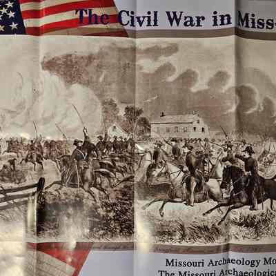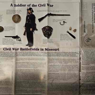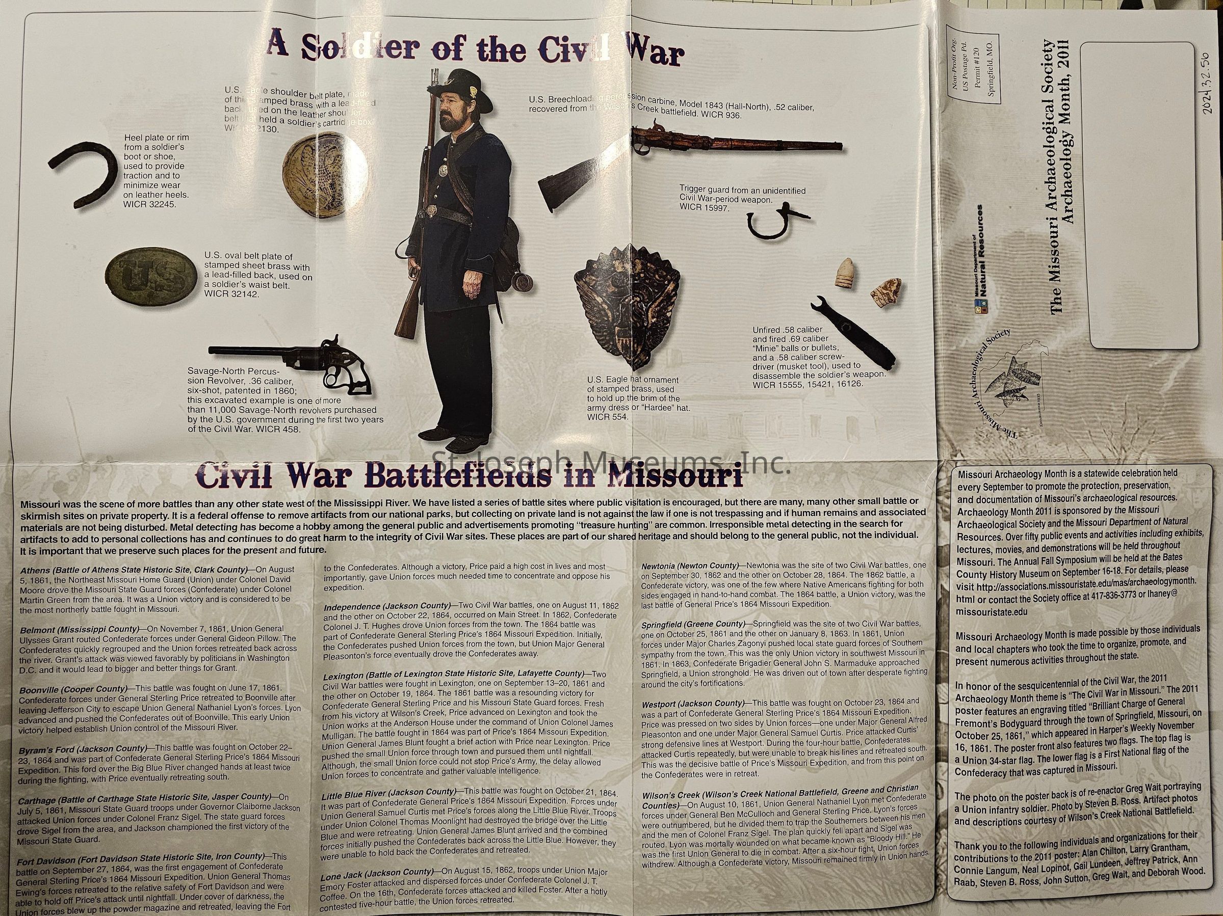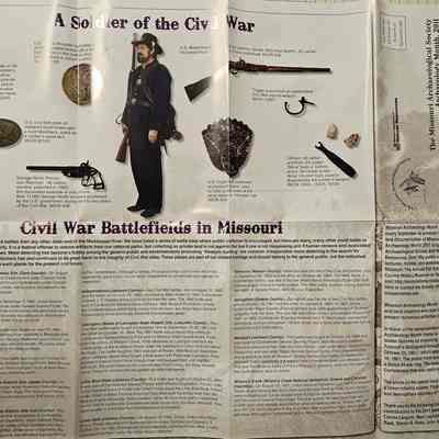 Created by the Missouri Archaeological Society for Missouri Archaeology Month 2011. One side has an image of the charge of General Fremont's bodyguard through the town of Springfield, MO on October 25, 1861. The reverse has an infographic of a soldier in the civil war and a list of civil war battlefields in MO.Context