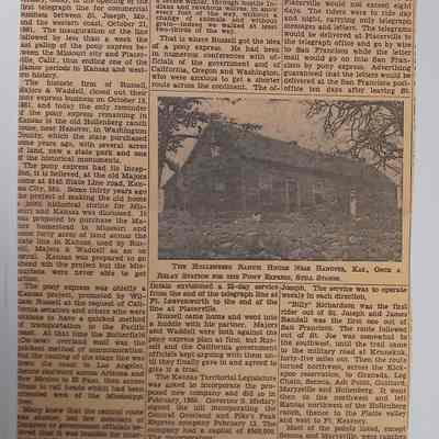 The article contains a sub-title "Line Operated by Russell, Major & Waddell Firm Between St. Joseph and Placerville, Calif., Was Believed to Have Been Organized at Old Majors Homestead - Riders Carried Mail and Telegrams in 8-Day Relay". Included in the article is a picture and the caption THE HOLLENBERG RANCH HOUSE NEAR HANOVER, KAS, ONCE A RELAY STATION FOR THE PONY ESPRESS, STILL STANDSLexicon