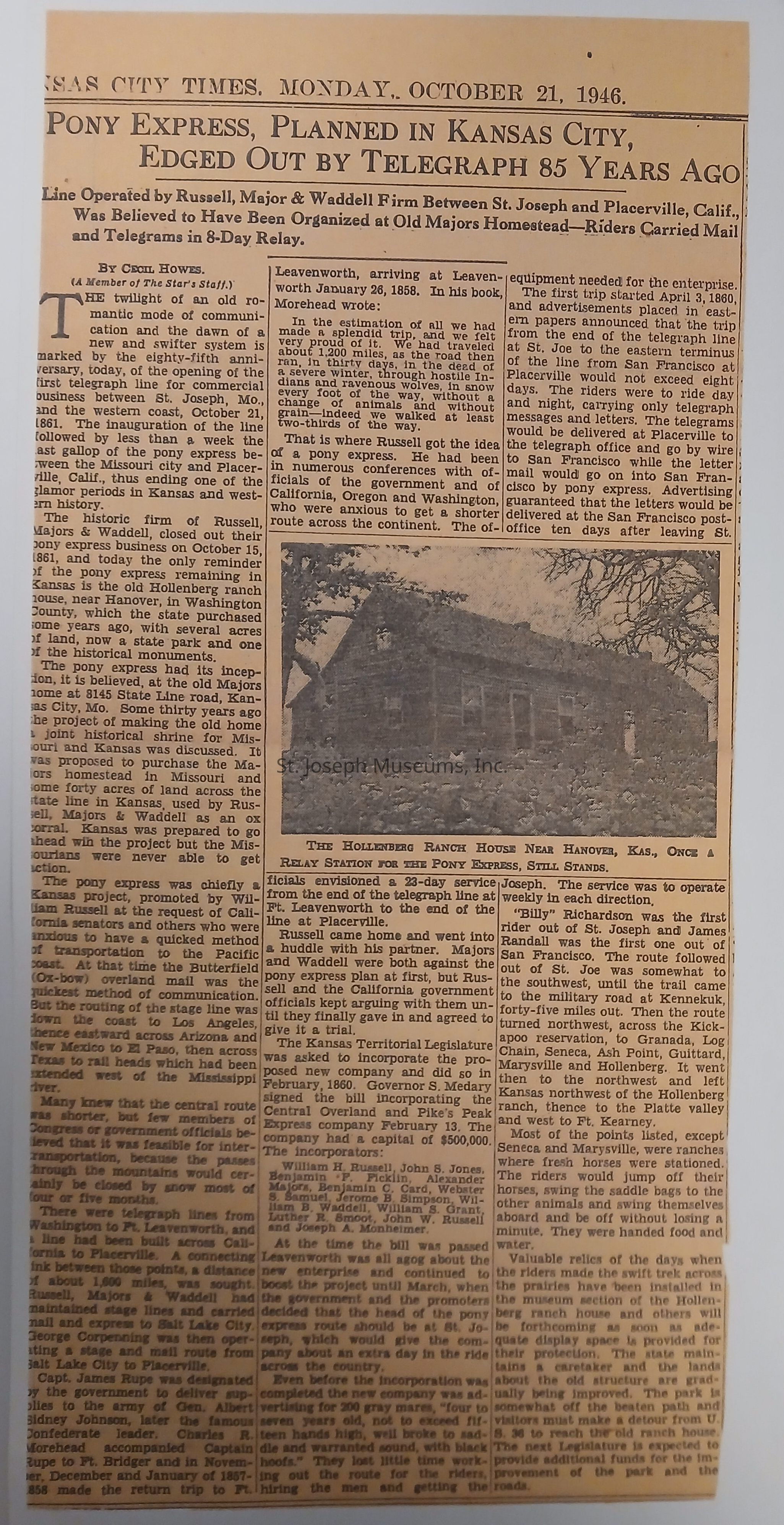 A copy of the newspaper article in the Kansas City Times dated October 21, 1946 titled "Pony Express, Planned In Kansas City, Edged Out By Telegraph 85 Years Ago". It was written by Cecil Howes of the Star's Staff.Context