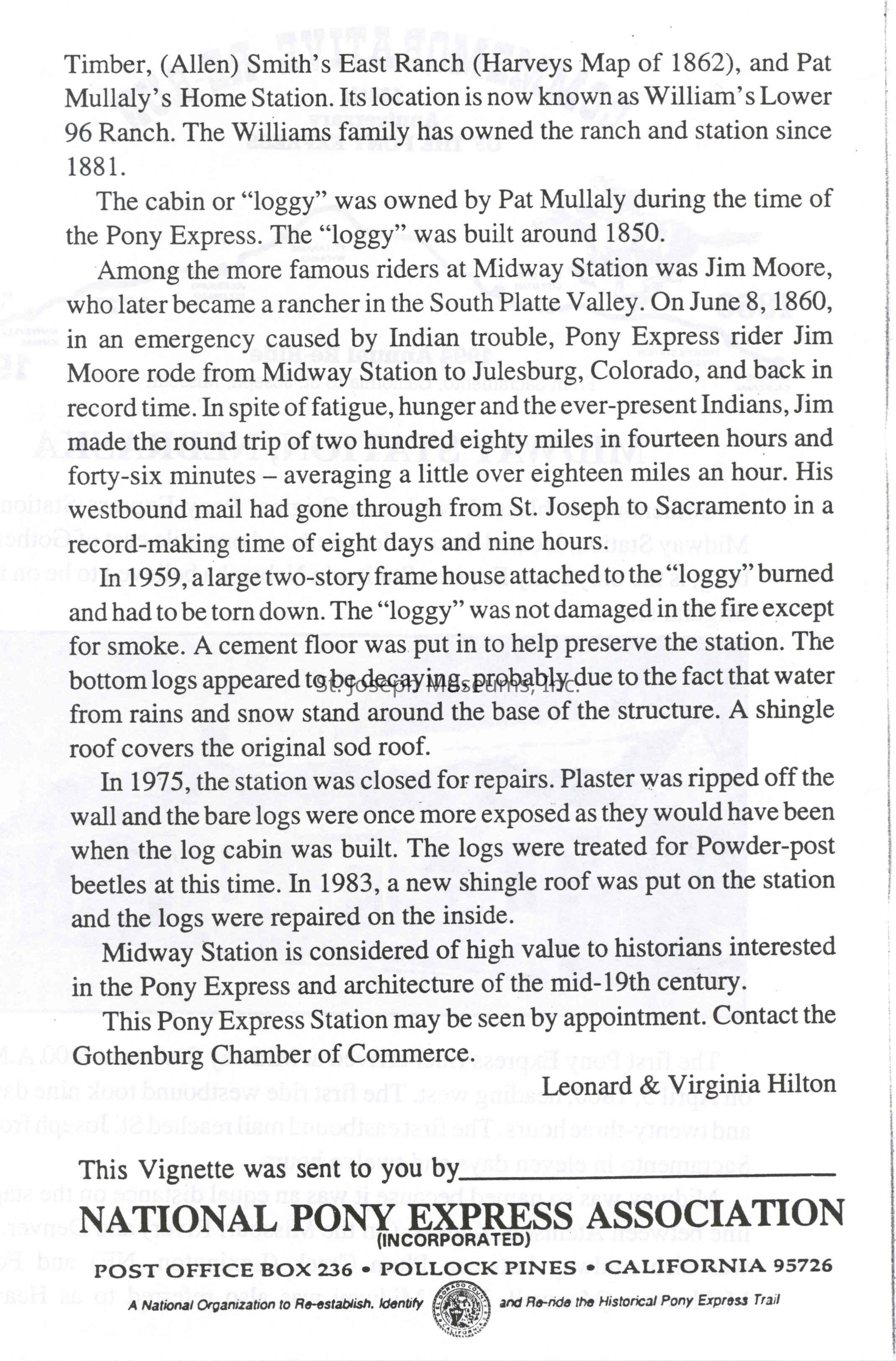 Files contain correspondence with Pony Rider descendants, Pony Express rider biographies, newspaper clippings related to the Pony Express, and miscellaneous records, photos, and documents collected from major private and University libraries among other sources. NOTE ABOUT ORIGIN OF LIBRARIES FILE. Prior to the opening of the renovated Pony Express Museum in 1993, St. Joseph Museum staff did extensive research on the Pony Express. All of the libraries in this folder were visited and copies of all material related to the Pony Express were made. This was done from 1991 to 1993. Information from this research was used in the new exhibits of the Pony Express Museum and in preparation of the book On the Winds of Destiny. In 2015, the file from the Pony Express Museum was added. Jackie Lewin 7/27/15 CD containing scans of actual documents found in Pony Express Research Files located in file cabinets in Document Storage II area.