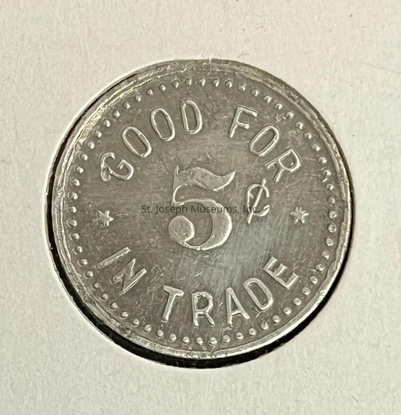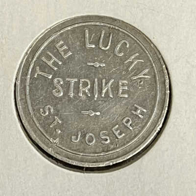 Coin/Metal/ "Good for 5c in trade"/ "The Lucky Strike St. Joseph"/In cardboard case/2"x2"
