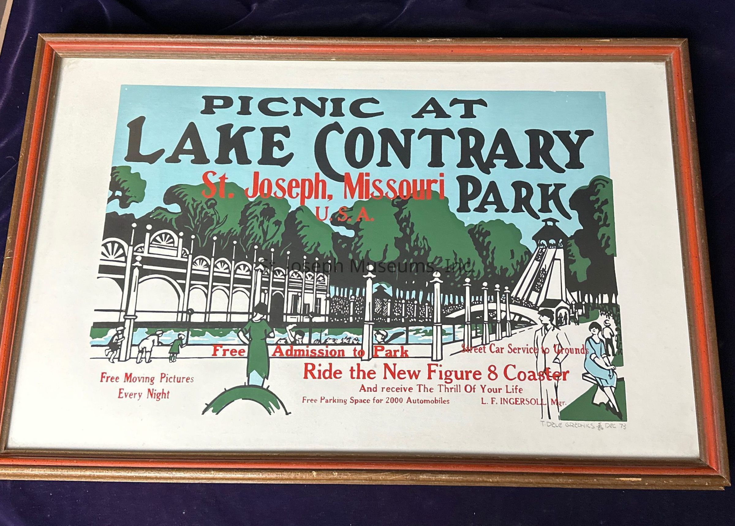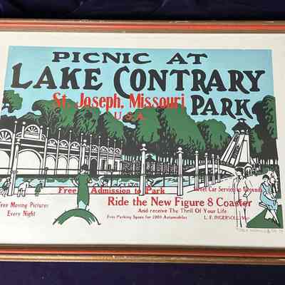 Framed advertisement for a picnic at Lake Contrary Park displaying vibrant colors, lush trees, and an inviting park entrance. Advertising highlights attractions like "Free Admission" and a "New Figure 8 Coaster."