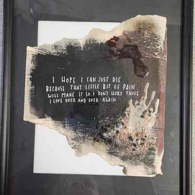Art/framed image/glue and gold flecks/ "I hope I can just die because that little bit of pain will make it so I don't hurt those I love over and over again"/15"x12"x0.5"Collection