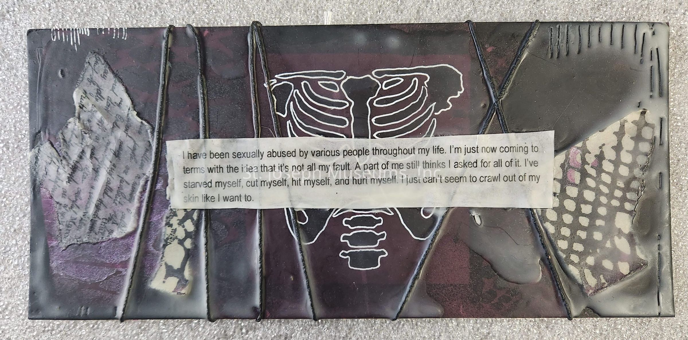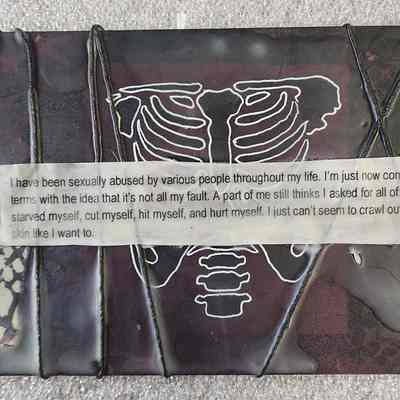Art/cardboard/black with a white ribcage and spine in the center/wrapped in twine and covered with wax/typed on paper/ "I have been sexually abused by various people throughout my life. I'm just now coming to terms with the idea that it's not all my fault. A part of me still thinks I asked for all of it. I've starved myself, cut myself, hit myself, and hurt myself. I just can't seem to crawl out of my skin like I want to."/11.25"x5.25"Collection