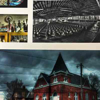 Photo set of the Seventeenth Street Community of Christ. The top left image is of a stained glass window with a cross circled by a crown, with a sun on the left and moon and stars on the right. The middle left image is of a shelf with various dolls and objects from the church's history as well as crosses and religious objects. the top right image is a black and white view of the sanctuary seating from the side. The bottom image is an exterior photo of the church main entrance and sign from diagonally across the street.