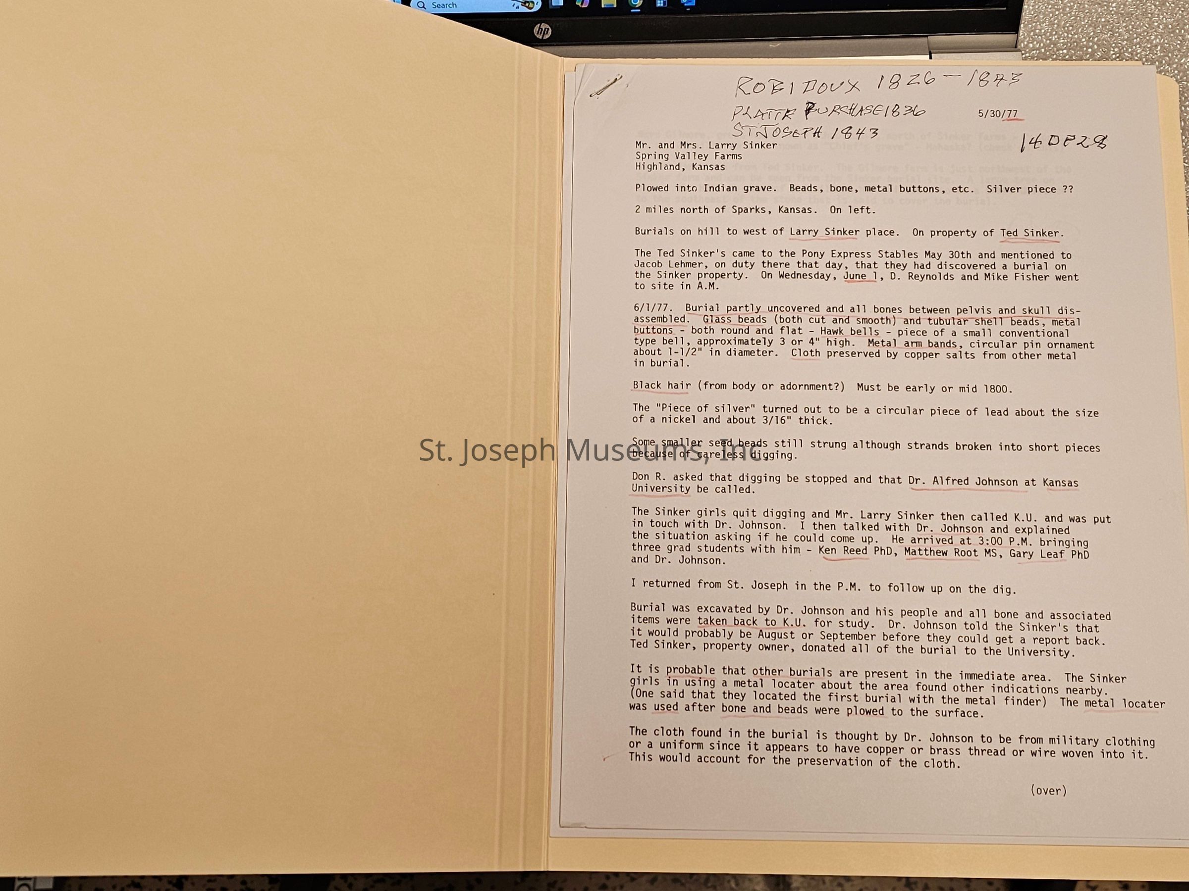 Letter from Don Reynolds to Larry Sinker, Spring Valley Farms, Highland, KS dated 5/30/77, profiling excavation at the farm north of Sparks, KS.