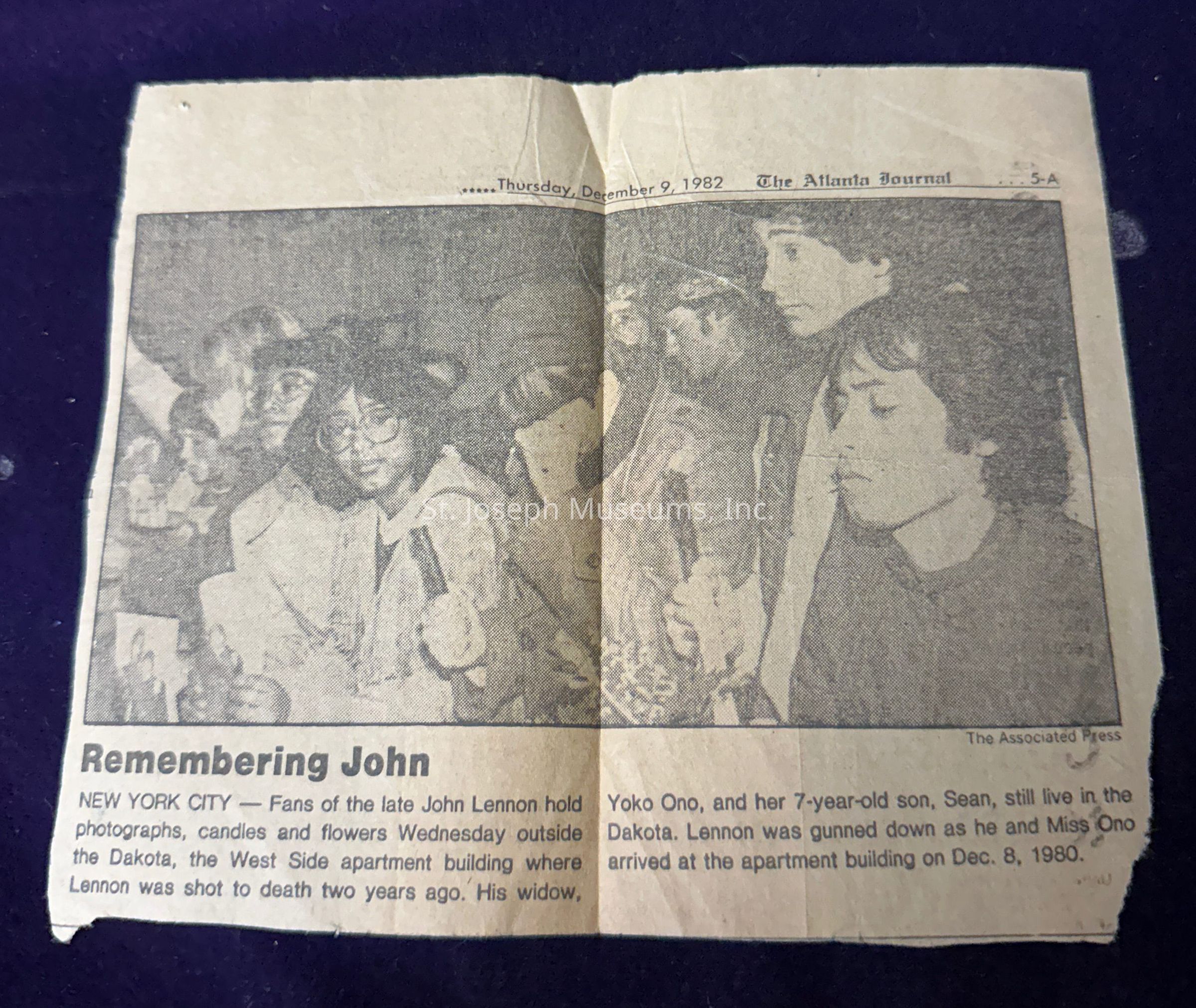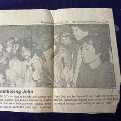 Newspaper clipping titled “Remembering John” discussing Lennon’s legacy and death in 1980. A photo showcases a memorial held by fans.