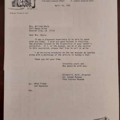 Correspondence between RIch Nolf, Director, St. Joseph Museum and Shippe daughter, Jane Rhule concerning donation of the collection, April 16, 1985.