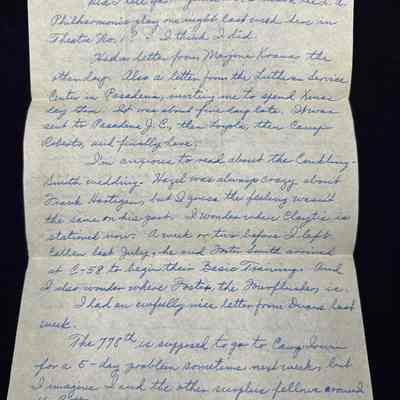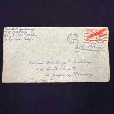 Handwritten letter home to parents back in St. Joseph after being called up to serve in the US Army during WWII. Pvt. Spalsbury, at the time of this letter, has completed Basic Training at Camp Callan, California, was stationed for a short time with a STAR Unit for ASTP (Army Specialized Training Program) soldiers in Pasadena, CA then moved to engineering training at Loyola University in Los Angeles, CA. After flunking out of the ASTP program, Robert was briefly stationed at Camp Roberts, located in central California assigned to the Infantry Replacement Training Center. At the time of this letter, Robert is stationed at Camp Haan in southern California, a U.S. Army training camp for Coast Artillery Anti Aircraft gunners.