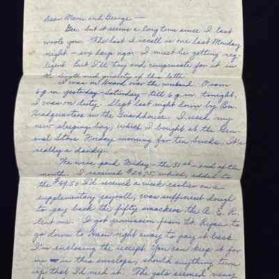 I was on Guard over the weekend. From 6 p.m. yesterday - Saturday - till 6 p.m. tonight, I was on duty. Slept last night down by Bn. Headquarters in the Guardhouse. I used my new sleeping bag, which I bought at the General Store Friday morning for ten bucks. It's really a dandy.