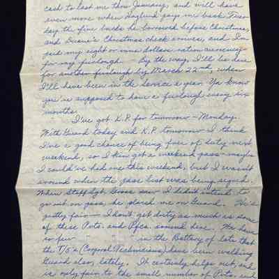 I've got K.P. for tomorrow - Monday. With Guard today and K.P. tomorrow I think I've a good chance of being free of duty next weekend, so I kin get a weekend pass - maybe. I could've had one this weekend, but I wasn't around when the pass list was being signed. When Staff Sgt. Gross saw I didn't intend to go out on pass, he placed me on Guard. He's pretty fair - I don't get duty as much as some of these Pvts. and Pfcs. around here. We have so few Pvts. and Pfcs. in the Battery of late that the T/5's (Corporal Technicians) have been walking Guard also, lately. It certainly helps out, and is only fair to the small number of Pvts. and Pfcs. around here.