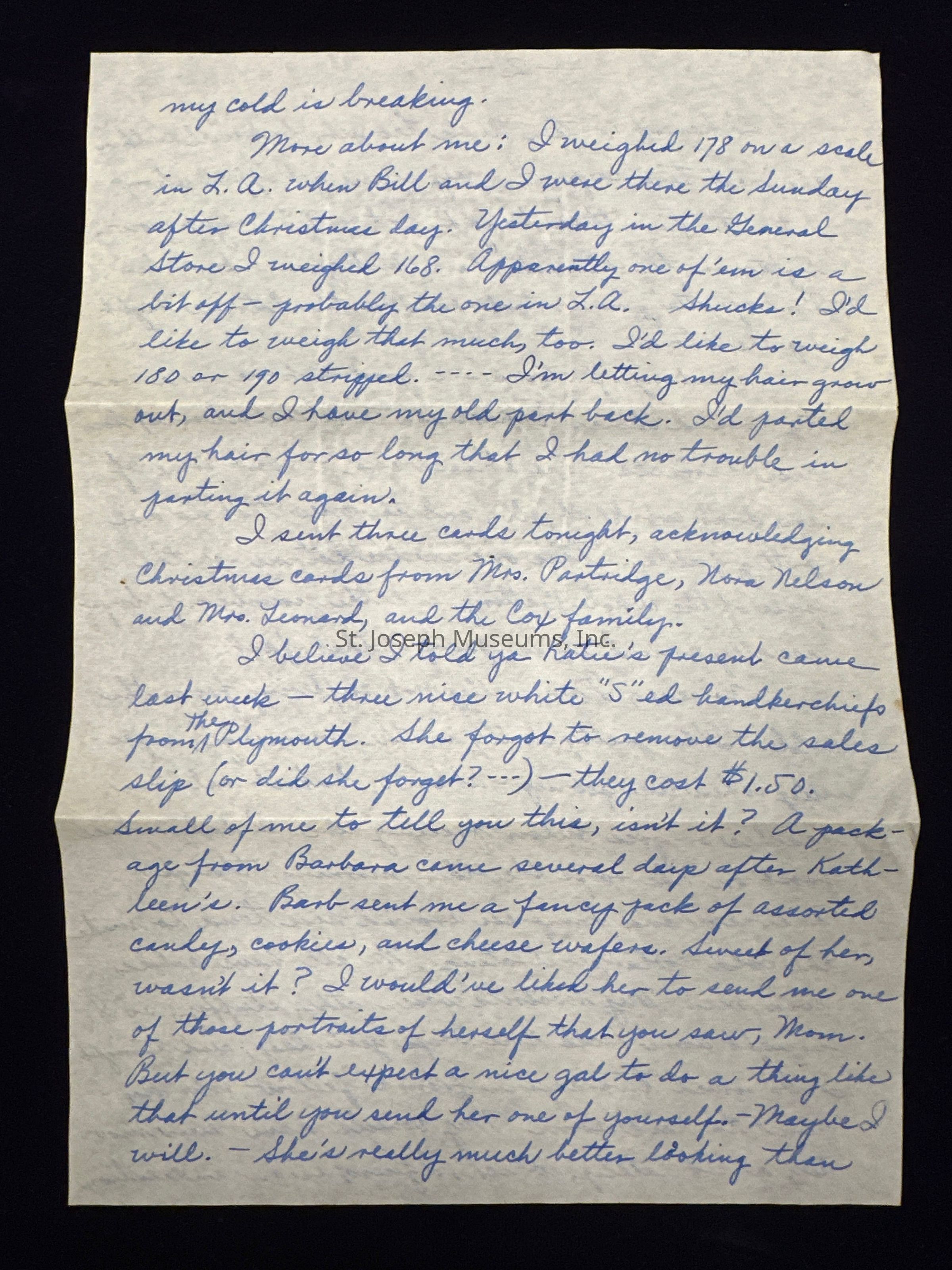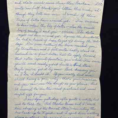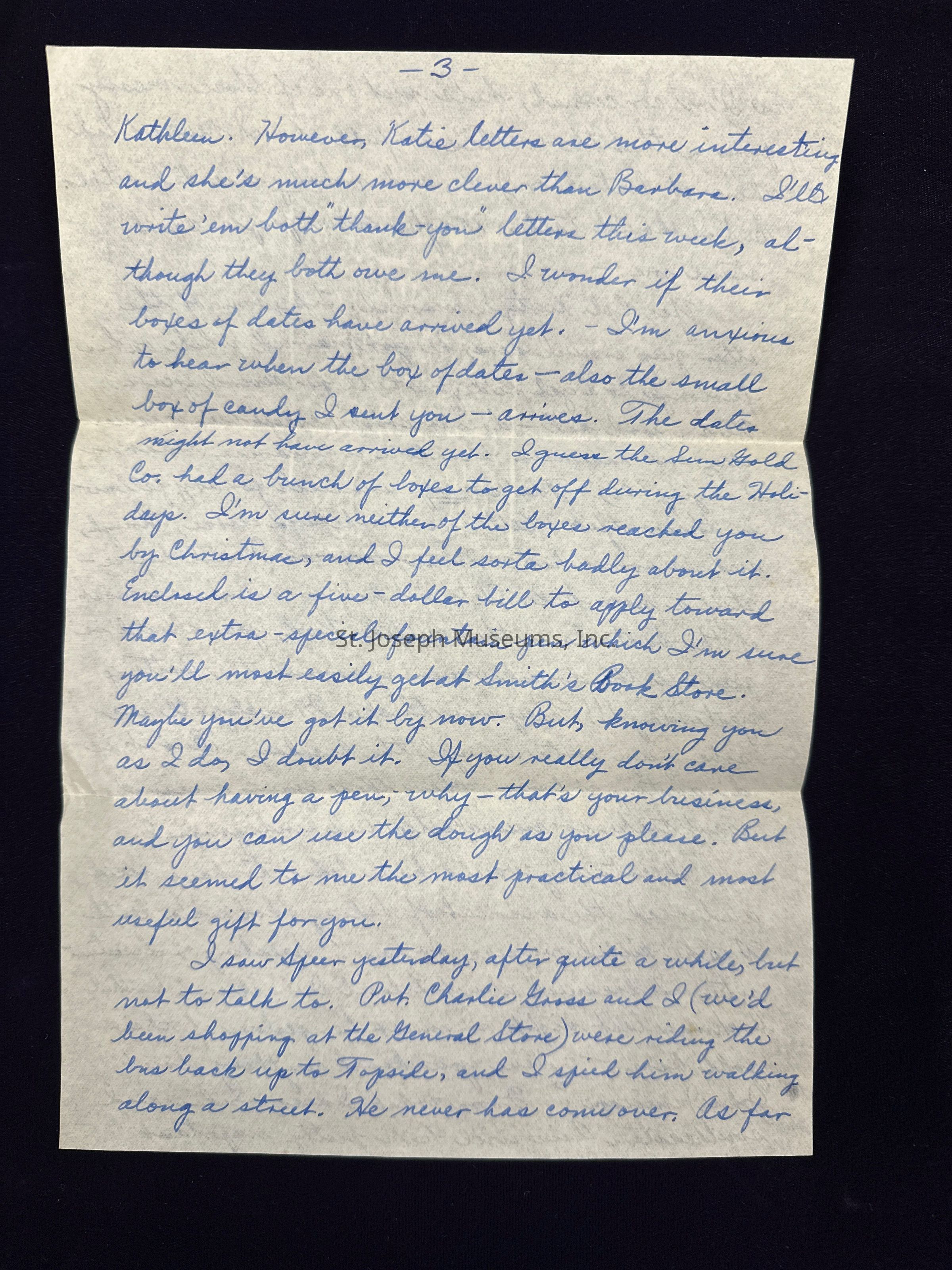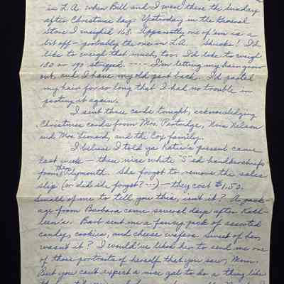 I believe I told ya Katie's present came last week - three nice white "S"ed handkerchiefs from The Plymouth. She forgot to remove the sales slip (or did she forget?---) - they cost $1.50. Small of me to tell you this, isn't it? A package from Barbara came several days after Kathleen's. Barb sent me a fancy pack of assorted candy, cookies, and cheese wafers. Sweet of her, wasn't it? I would've liked her to send me one of those portraits of herself that you saw, Mom. But you can't expect a nice gal to do a thing like that until you send her one of yourself. - Maybe I will. -She's really much better looking than Kathleen. However, Katie letters are more interesting and she's much more clever than Barbara. I'll write 'em both "thank-you" letters this week, although they both owe me. I wonder if their boxes of dates have arrived yet. -I'm anxious to hear when the box of dates -also the small box of candy I sent you - arrives. The dates might not have arrived yet. I guess the Sun Gold Co. had a bunch of boxes to get off during the Holidays. I'm sure neither of the boxes reached you by Christmas, and I feel sorta badly about it. Enclosed is a five - dollar bill to apply toward that extra-special fountain pen which I'm sure you'll most easily get at Smith's Book Store. Maybe you've got it by now. But, knowing you as I do, I doubt it. If you really don't care about having a pen, - why - that's your business, and you can use the dough as you please. But it seemed to me the most practical and most useful gift for you.