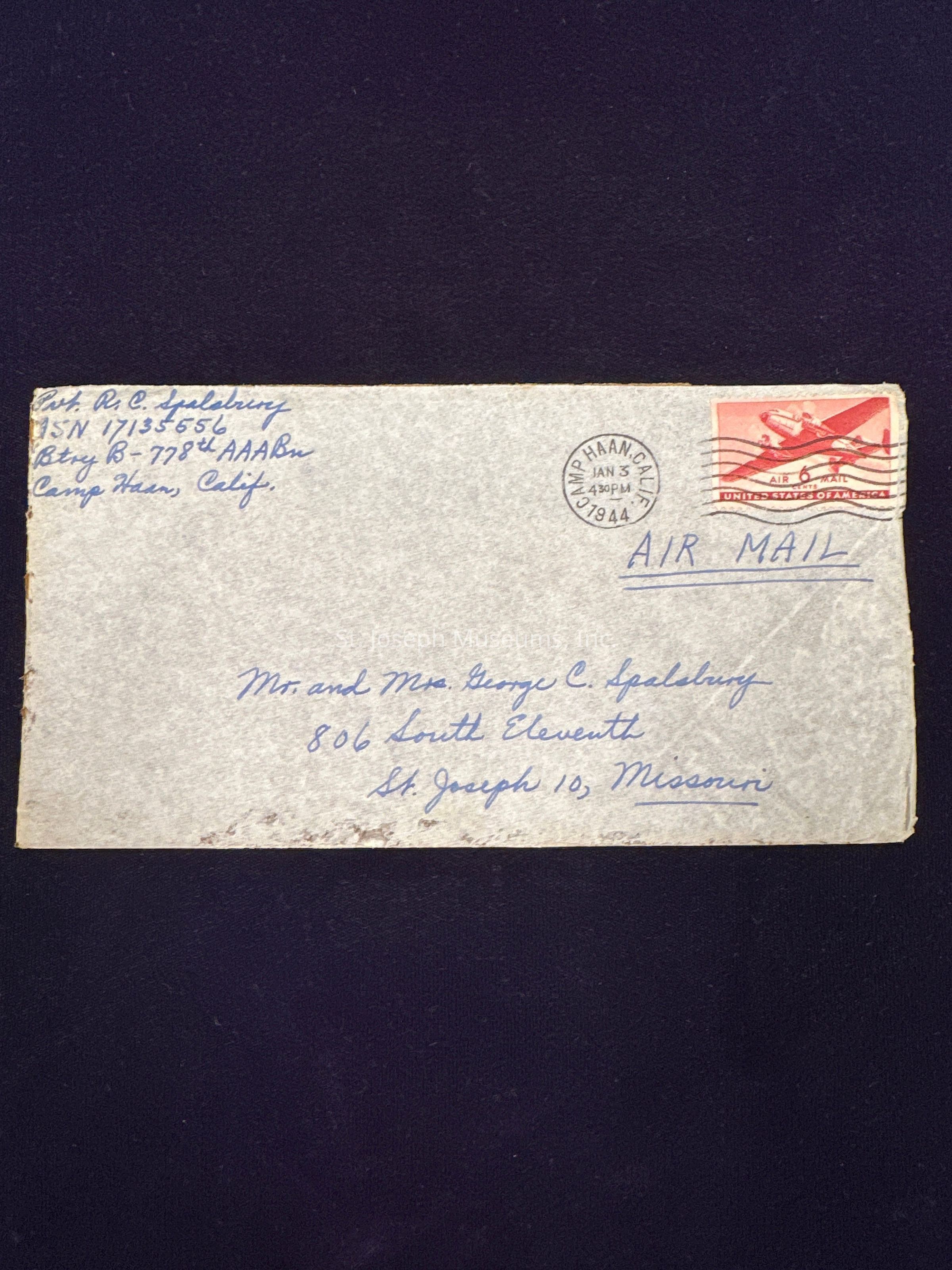 Letter Home from Pvt. R. C. Spalsbury, ASN 17135556, Btry B - 778th AAA Bn, Camp Haan, California to his parents Mr. and Mrs. George C. Spalsbury, 806 South Eleventh, Saint Joseph 10, Missouri. Post Marked JAN 3, 1944, 4:30 PM, Camp Haan, Calif., 6 cents Air Mail stamp.Description