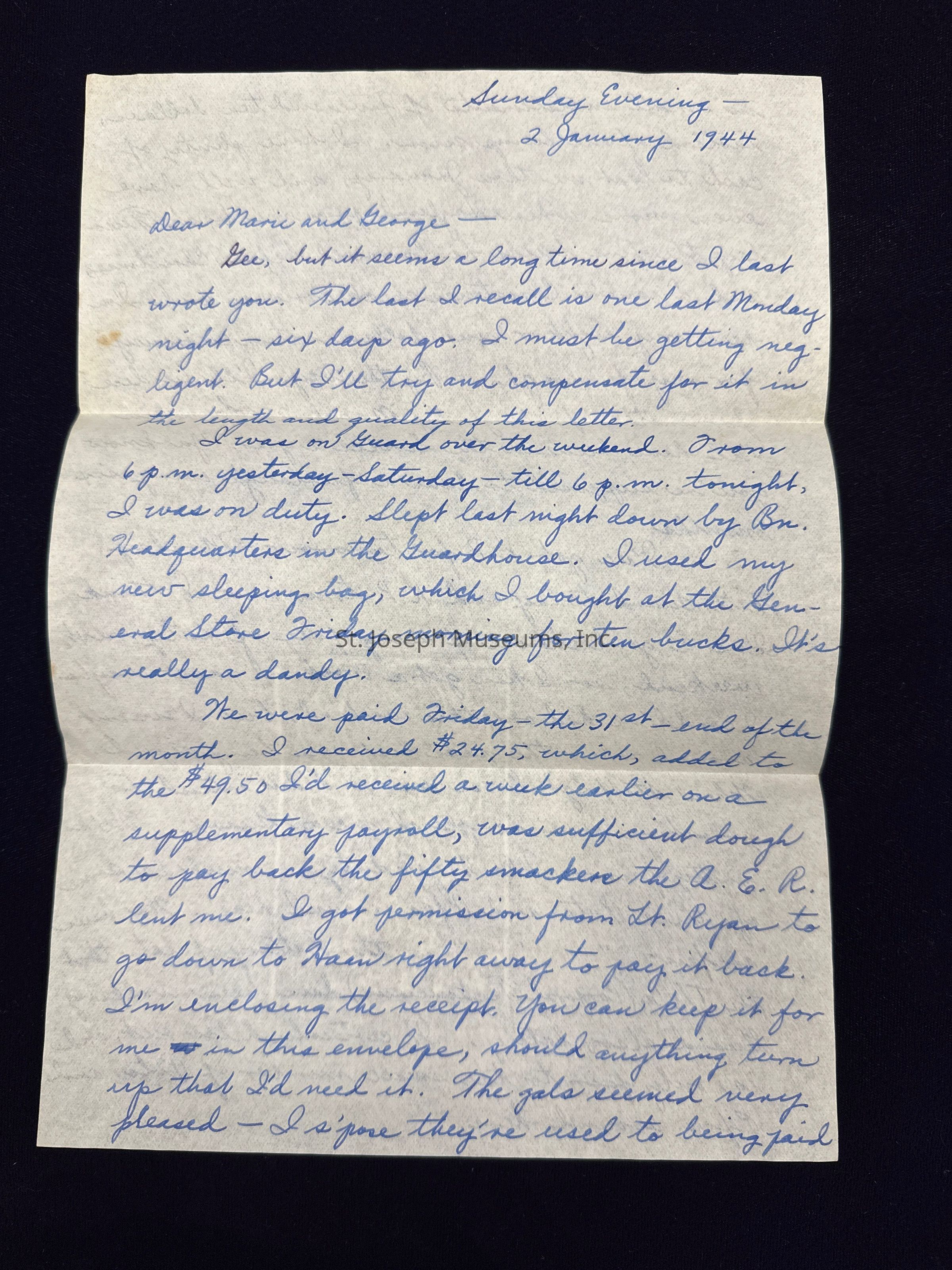 We were paid Friday - the 31st - end of the month. I received $24.75, which, I added to the $49.50 I'd received a week earlier on a supplementary payroll, was sufficient dough to pay back the fifty smackers the A.E.R. lent me. I got permission from Lt. Ryan to go down to Haan right away to pay it back. I'm enclosing the receipt. You can keep it for me in this envelope, should anything turn up that I'd need it. The gals seemed very pleased - I s'pose they're used to being paid in small installments of five and ten dollars, instead of one lump sum. I have plenty of cash to last me thru January, and will have even more when Haglund pays me back Tuesday the five bucks he borrowed before Christmas, and Duane's Christmas check arrives, and I'm paid my eight or nine dollars ration currency for my furlough. By the the way, I'll be due for another furlough by March 22nd, when I'll have been in the Service a year. Ya know you're supposed to have a furlough every six months.