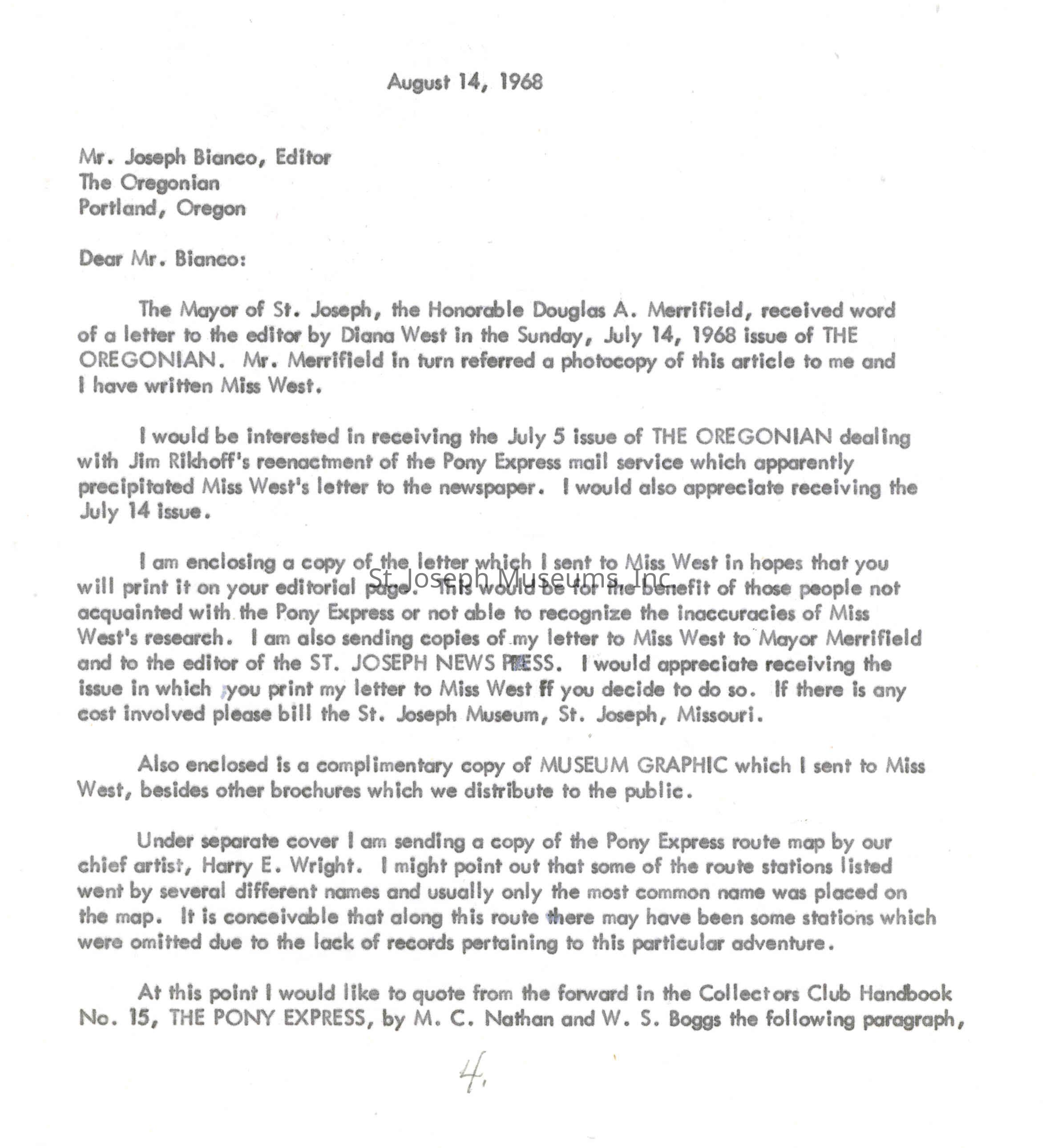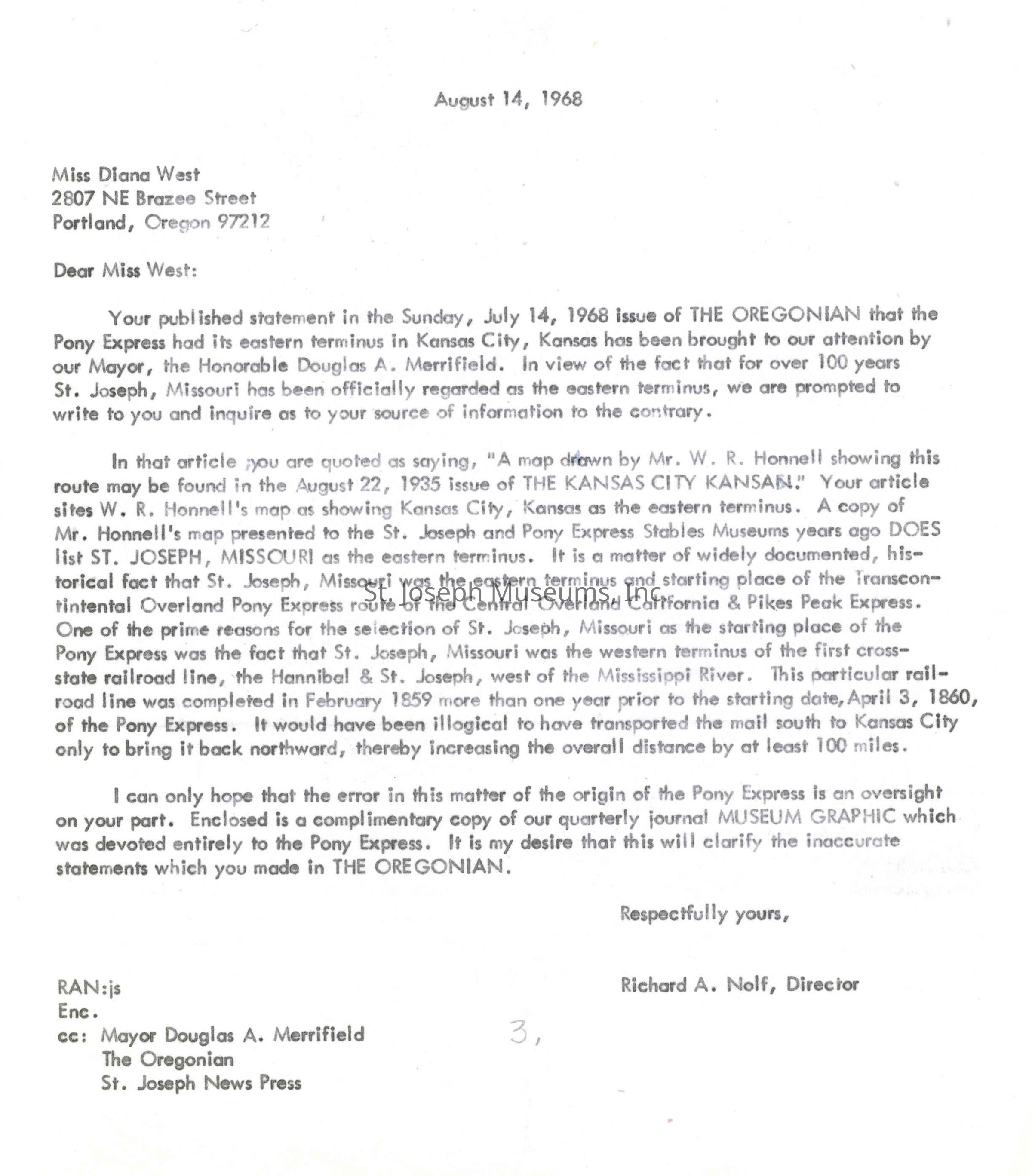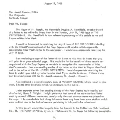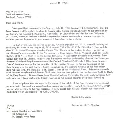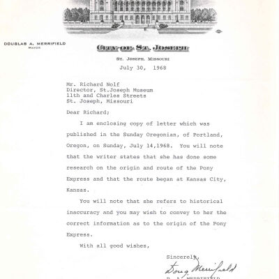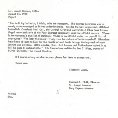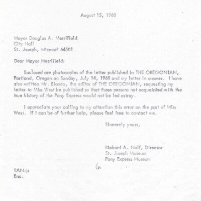 Files contain correspondence with Pony Rider descendants, Pony Express rider biographies, newspaper clippings related to the Pony Express, and miscellaneous records, photos, and documents collected from major private and University libraries among other sources. NOTE ABOUT ORIGIN OF LIBRARIES FILE. Prior to the opening of the renovated Pony Express Museum in 1993, St. Joseph Museum staff did extensive research on the Pony Express. All of the libraries in this folder were visited and copies of all material related to the Pony Express were made. This was done from 1991 to 1993. Information from this research was used in the new exhibits of the Pony Express Museum and in preparation of the book On the Winds of Destiny. In 2015, the file from the Pony Express Museum was added. Jackie Lewin 7/27/15 CD containing scans of actual documents found in Pony Express Research Files located in file cabinets in Document Storage II area.
