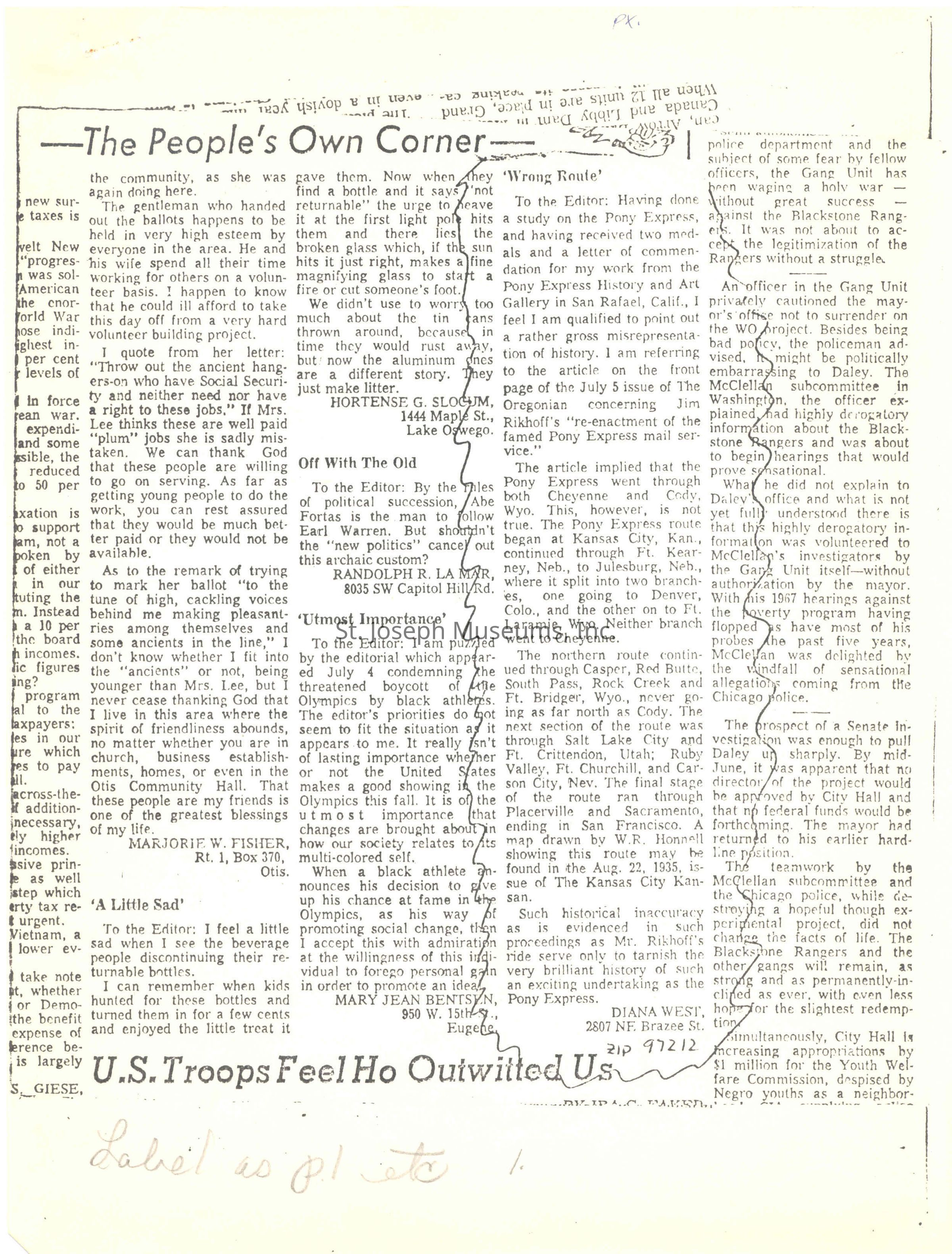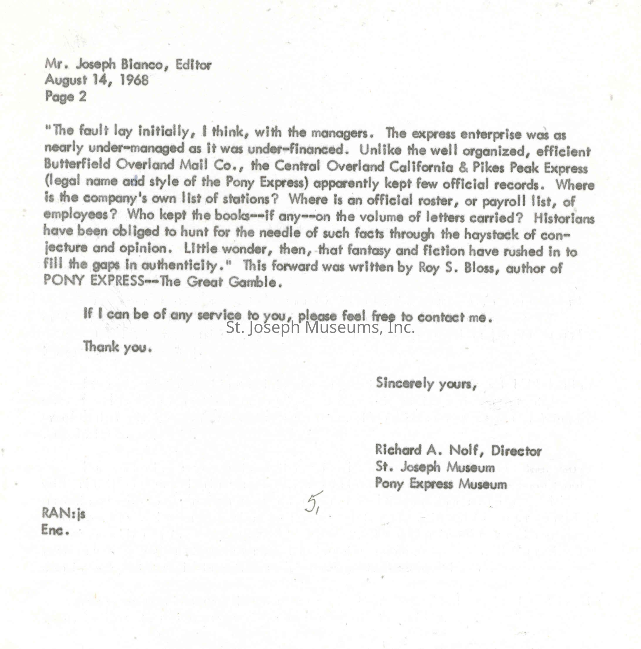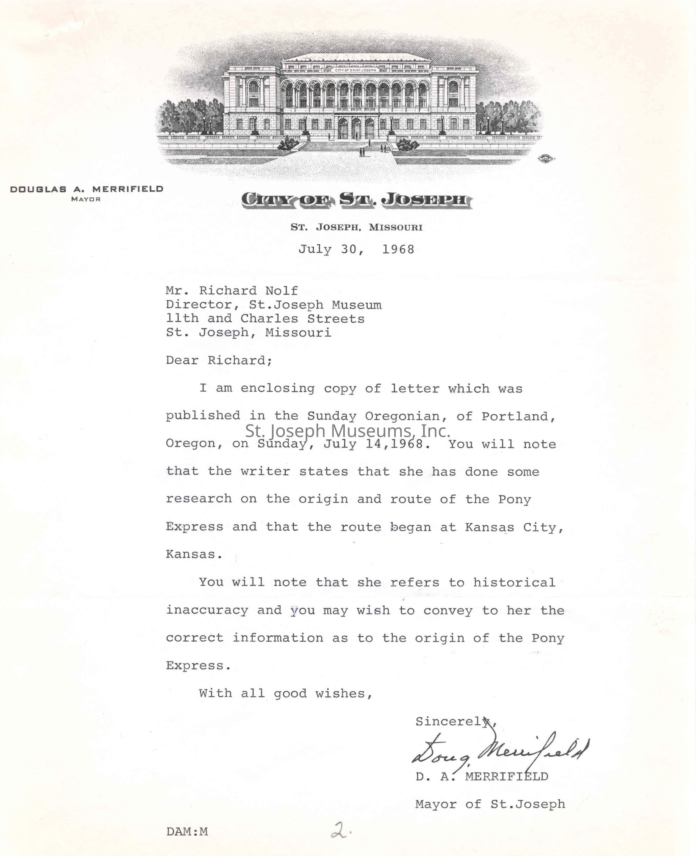 Files contain correspondence with Pony Rider descendants, Pony Express rider biographies, newspaper clippings related to the Pony Express, and miscellaneous records, photos, and documents collected from major private and University libraries among other sources. NOTE ABOUT ORIGIN OF LIBRARIES FILE. Prior to the opening of the renovated Pony Express Museum in 1993, St. Joseph Museum staff did extensive research on the Pony Express. All of the libraries in this folder were visited and copies of all material related to the Pony Express were made. This was done from 1991 to 1993. Information from this research was used in the new exhibits of the Pony Express Museum and in preparation of the book On the Winds of Destiny. In 2015, the file from the Pony Express Museum was added. Jackie Lewin 7/27/15 CD containing scans of actual documents found in Pony Express Research Files located in file cabinets in Document Storage II area.