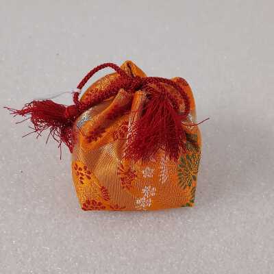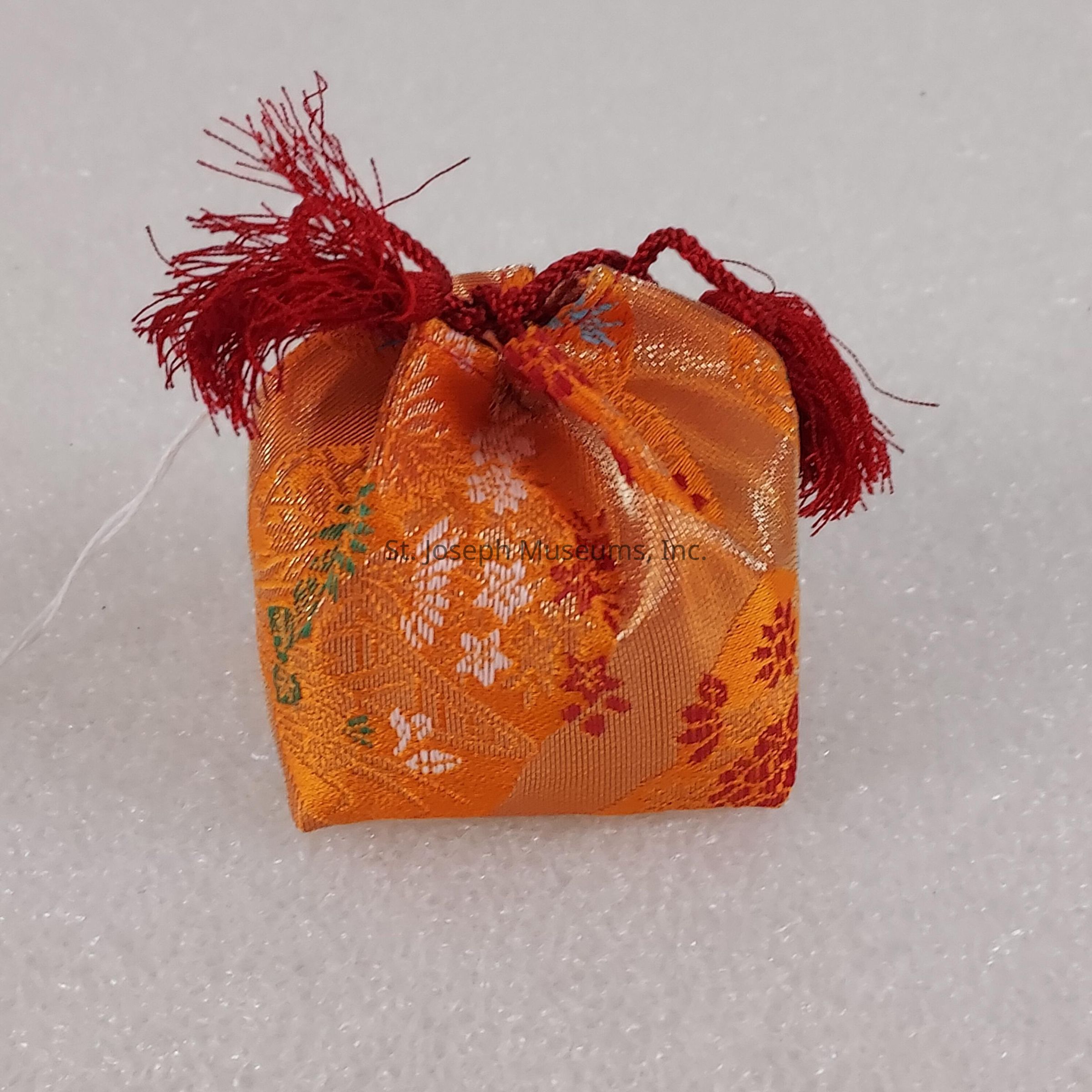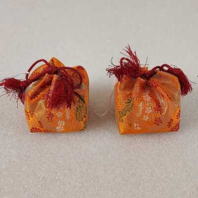 Pair of orange bags with flower patterns on them. Bother bags have a red drawstring rope and tassle.