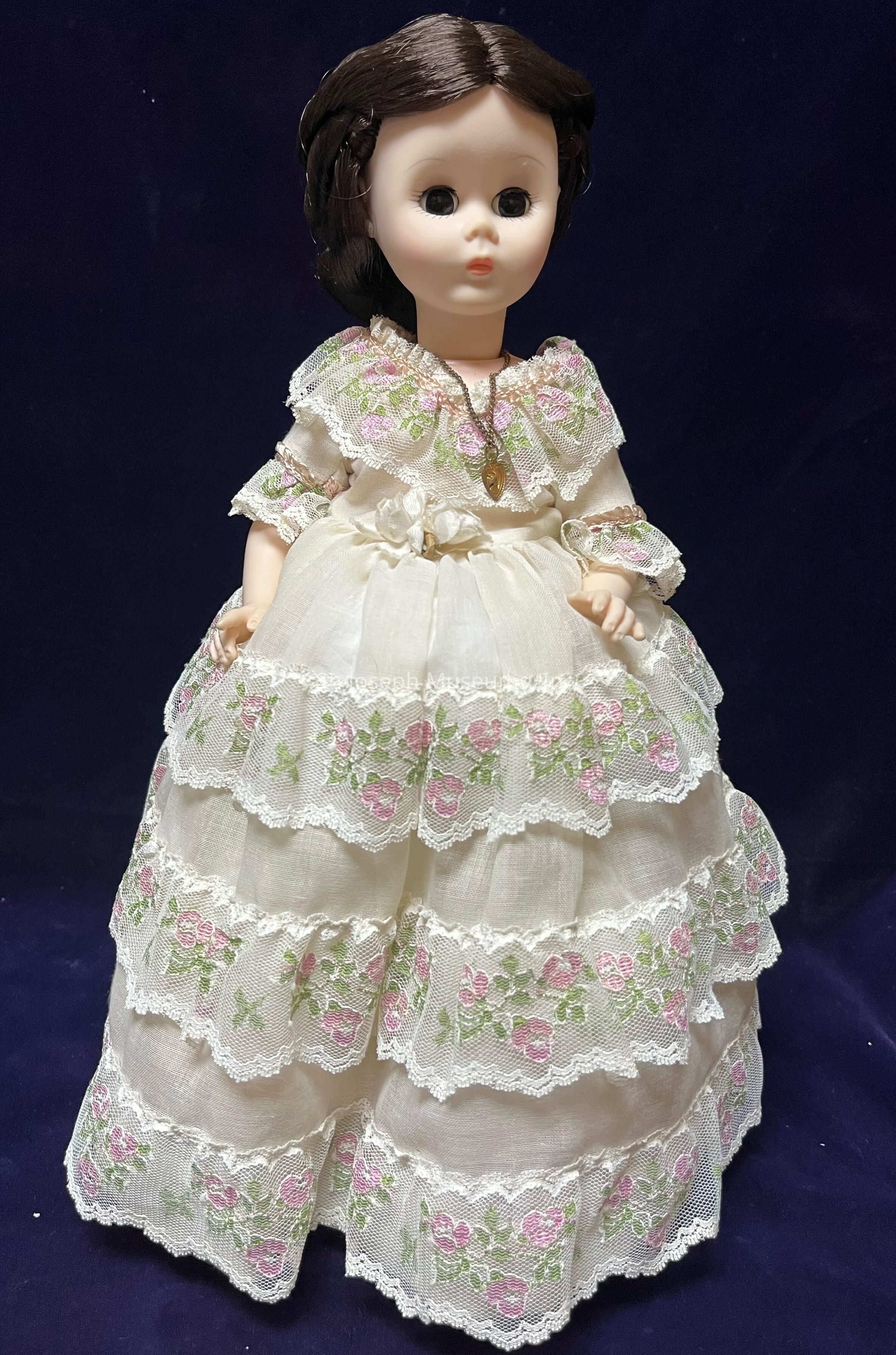 A Julia Tyler doll that has dark brown hair styled in an elegant updo. The dress is cream-colored with multiple layers of lace adorned with pink floral embroidery and green leaves. Around the doll's neck hangs a small gold necklace with a pendant.