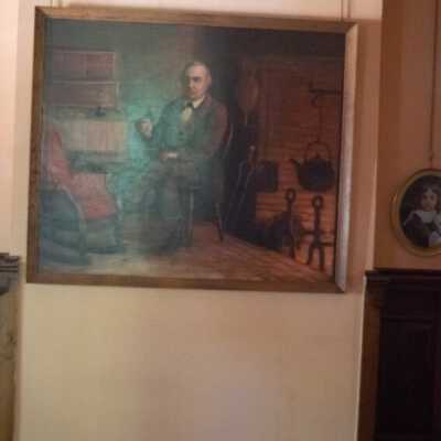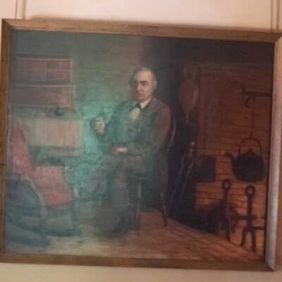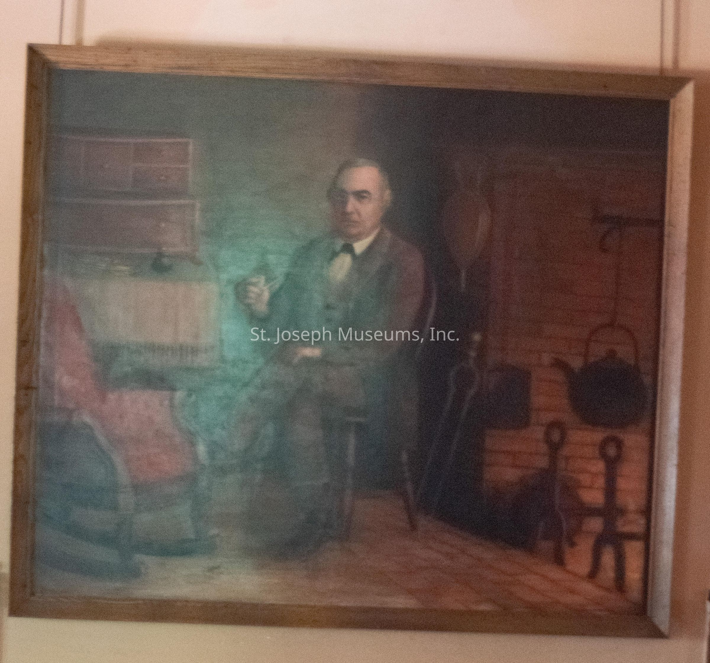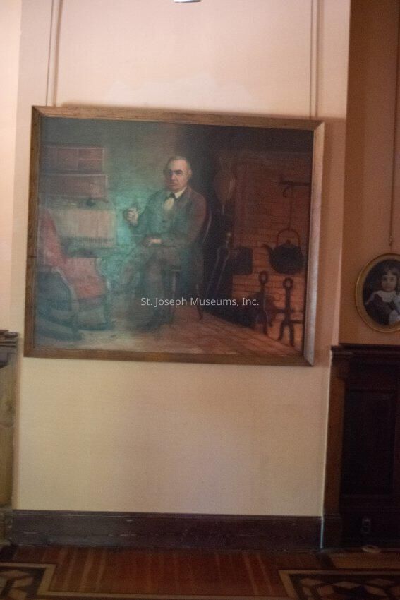 Painting/oil/very large/Joseph Robidoux portrait/Artist: J.V.D. Patch/setting by fireplace smoking pipe/J. Robidoux, III