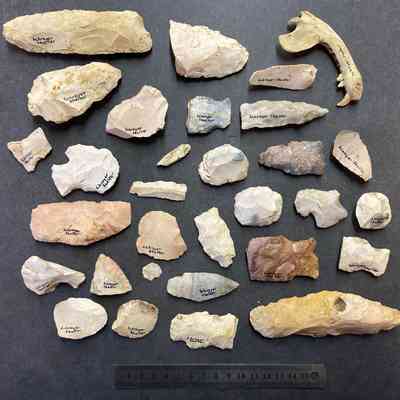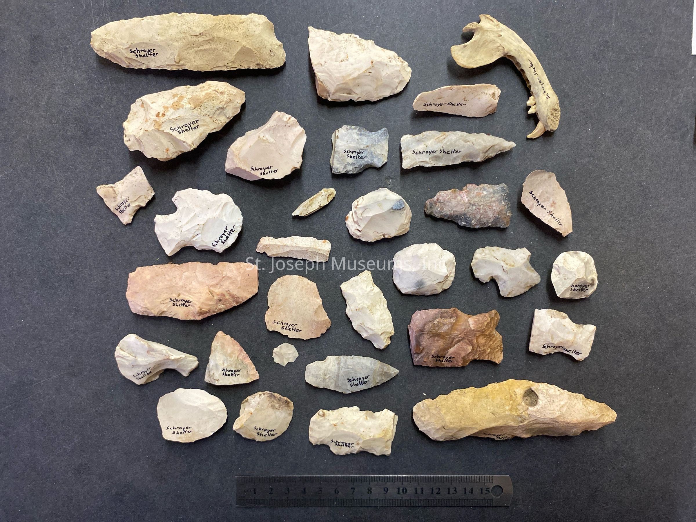 1 BAG OF 31/CHERT FLAKES, BIFACIAL PROJECTILE POINTS, SCRAPERS, 1 OPPOSSUM MANDIBLE FROM SCHROYER SHELTER WARREN CO MO/VARIOUS SIZESCollection