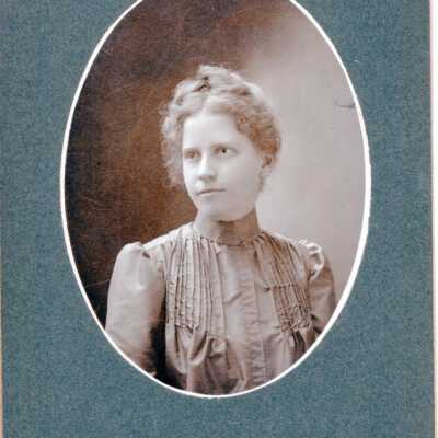 A = Photo of young woman, age 28, bust view in oval, matted. She is wearing her hair up, and a medium color dress with high collar and long sleeves, placated front with tight pleats. b/w. 4 ¼" x 6½". Byarlay Photographer. Handwritten on back: "Agnes Conrad, St. Joseph, Mo. 1902"