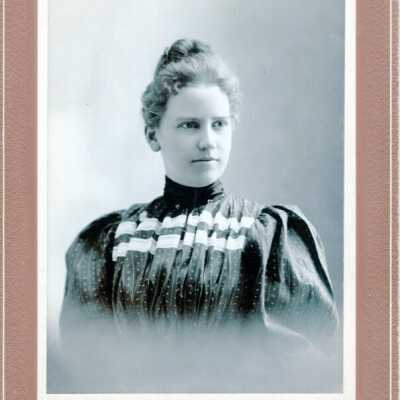 C = Photo of young woman. b/w Bust view. Her light hair is worn up on her head. She is wearing a dark dress with rows of white flecks, two white ribbons lined across upper bodice, pouf sleeves, high collar. 4¼" x 5¾" in brown mat 5¼" x 7¼". Uhlman, Photographer. Handwritten on back: "Agnes Conrad, 1902"